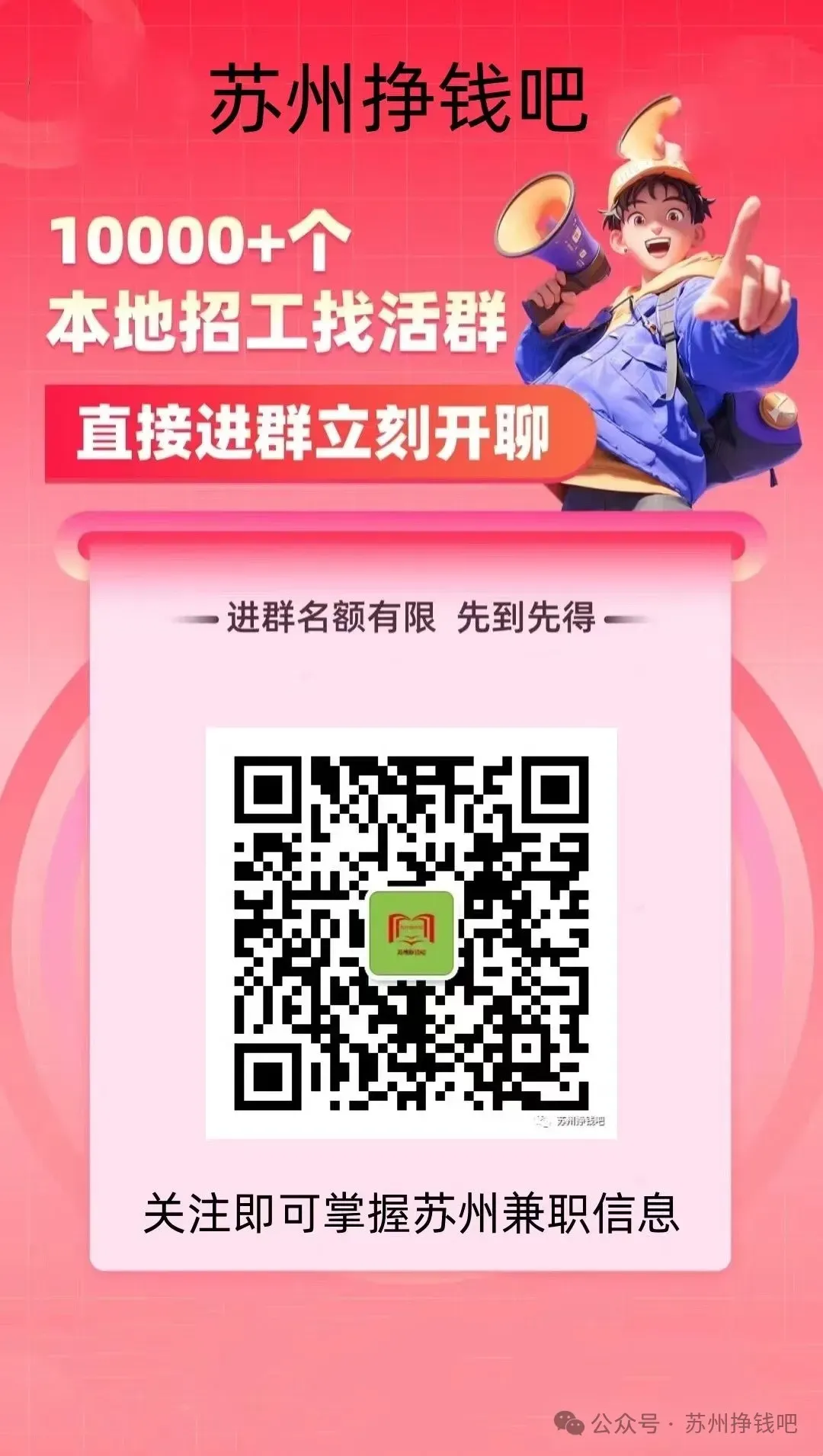 本平台每天17:00左右推送明天兼职信息(联系时兼职时就说在公众号.苏州挣钱吧里看到的信息)关注我微信公众号:suzhouzqb