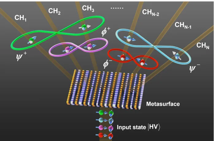 图1. 通过多通道超构表面的双光子量子干涉效应,实现四种贝尔态的构建与全通道组合纠缠分发示意图。