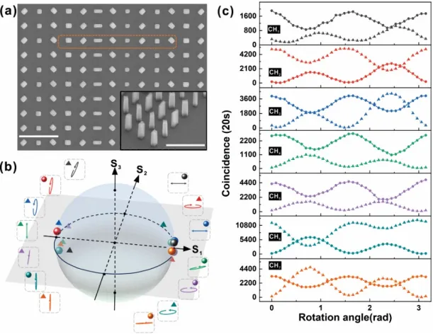 在本研究中,该团队创新性地提出并实验验证了基于单一超构表面实现偏振纠缠的产生与调控以及多通道分发(原理示意见图1)。该超构表面由尺寸与旋转角度各异的硅纳米棒结构单元构成,每个结构单元能够对入射光子沿结构单元主轴方向的两种正交线偏振分量引入可独立设计的附加相位。通过亚波长尺度的相位调控,超构表面被设计成具有N个空间输出通道,每个通道对应一种等效波片,从而对入射的双光子偏振态进行量子态调控。当彼此偏振正交、其他自由度全同的双光子入射该超构表面时,其在各通道间会发生双光子干涉。由于每个光子都有N种可能的输出通道,因此任意选择两个通道进行符合测量,均可获得一种偏振纠缠态。该系统可在N(N-1)/2个通道组合中产生并分发偏振纠缠态,实现全通道组合的纠缠态分发。