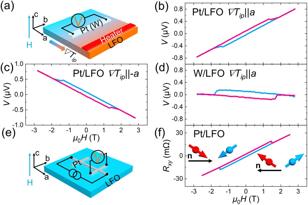 研究表明,LFO薄膜是一种具有交错磁体特征的弱铁磁体,并展现出源于其自旋分裂磁振子能带的独特磁振子输运现象。特别是,以LFO薄膜为例,为获得单晶及单反铁磁畴态以研究本征交错磁性提供了极具吸引力的机遇。MSSNE开辟了在反铁磁绝缘体中产生磁振子自旋流的新途径,并为设计基于交错磁体的自旋热电子器件提供了更多可能。后续研究可聚焦于通过调控奈尔矢量实现该效应的可调性。此外,其逆效应的潜在实现有望为深入理解交错磁体的本征特性提供新视角。