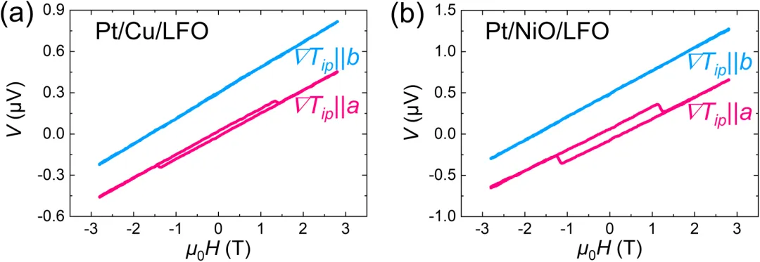 图1 (a) LFO中MSSNE的示意图,由纵向(a轴)温度梯度(∇T)产生的横向(c轴)磁振子自旋流(Jm);(b) 具有两个自旋相反的亚晶格Fe1和Fe2的LFO晶体结构,以及亚晶格转置变换{C2z||C2zτ3};(c) ac平面(kb=0)中的磁振子能带分裂;(d) bc平面(ka=0)中的磁振子能带简并图2 (a) 具有∇Tip||a轴和沿c轴方向扫描磁场的磁热测量装置示意图;(b) 具有∇Tip||a轴的Pt(3)/LFO的V值测量;(c) 与图(a)相比,具有反向∇Tip的Pt(3)/LFO的V值测量;(d) 具有∇Tip||a轴的W(3)/LFO的V值测量;(e) 沿a轴施加电流的霍尔测量装置示意图;(f) Pt(3)/LFO的霍尔电阻图3 (a) 具有∇Tip||b轴和沿c轴方向扫描磁场的Pt(3)/LFO的V值测量;(b) 不同θ下Pt(3)/LFO的面内各向异性MSSNE测量装置;(c) 不同角度θ的V值测量;(d) 从图(c)中提取的VMSSNE随θ的变化图4 沿a轴和b轴∇Tip的 (a) Pt(3)/Cu(1.2)/LFO和 (b) Pt(3)/NiO(0.6)/LFO的V值测量