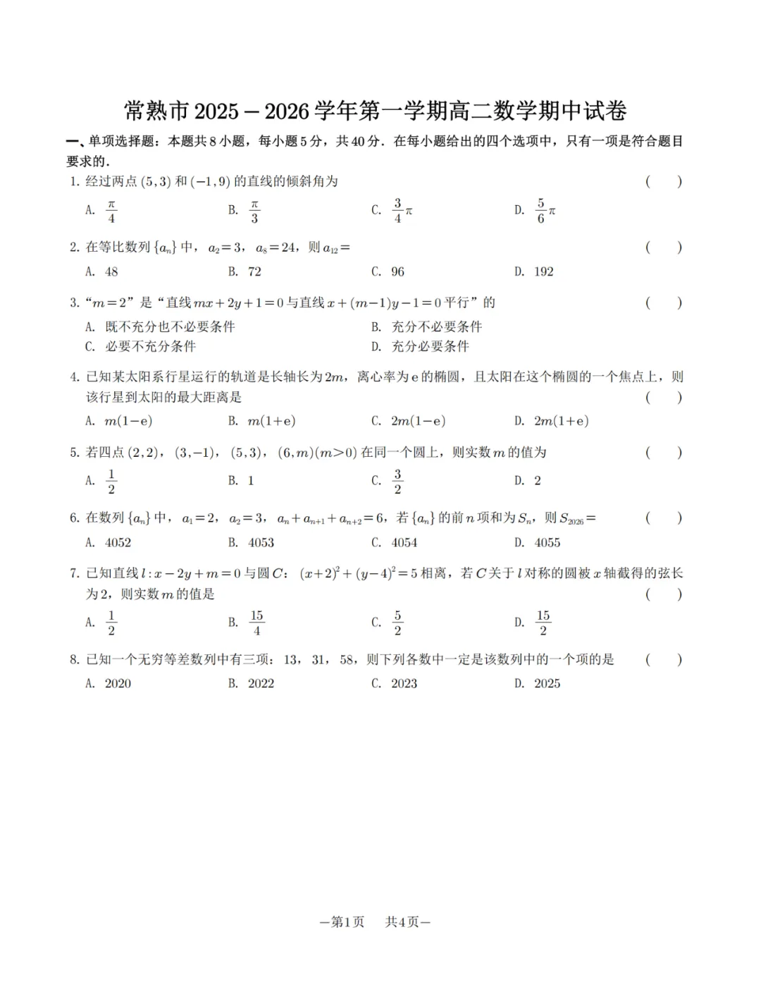 >江苏省苏州市常熟市2025-2026学年高二上学期期中考试数学试卷