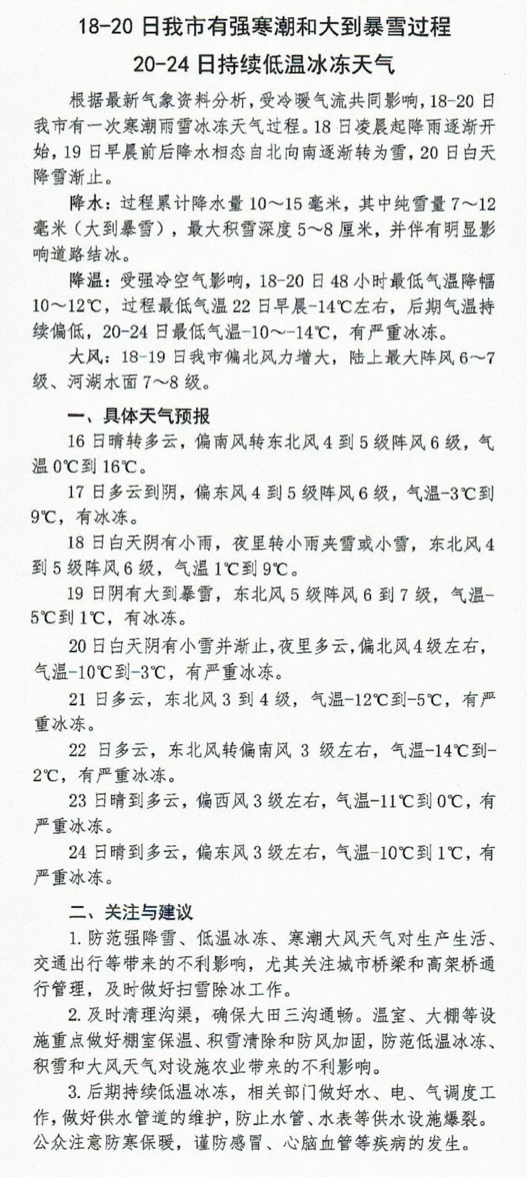 1、非必要不出行。如需出行务必高度注意冰雪路面的交通安全,同时要防范冰溜子、树枝、牌匾等高空坠物伤人,时刻注意人身安全。