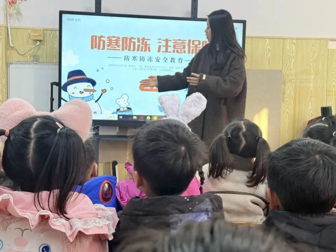 各班教师以故事、视频、图片讲解等形式进行防寒防冻、防滑防摔和安全出行等方面的安全教育。通过安全教育,增强师幼雨雪天气的安全意识,提高对防范恶劣天气的认识,了解防寒、防冻、防滑等知识,掌握遇路面结冰、积雪时,行走的安全措施。