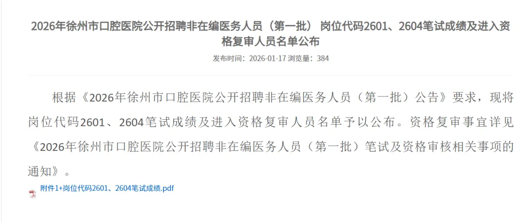 >2026年徐州市口腔医院公开招聘非在编医务人员(第一批)岗位代码2601、2604笔试成绩及进入资格复审人员名单公布