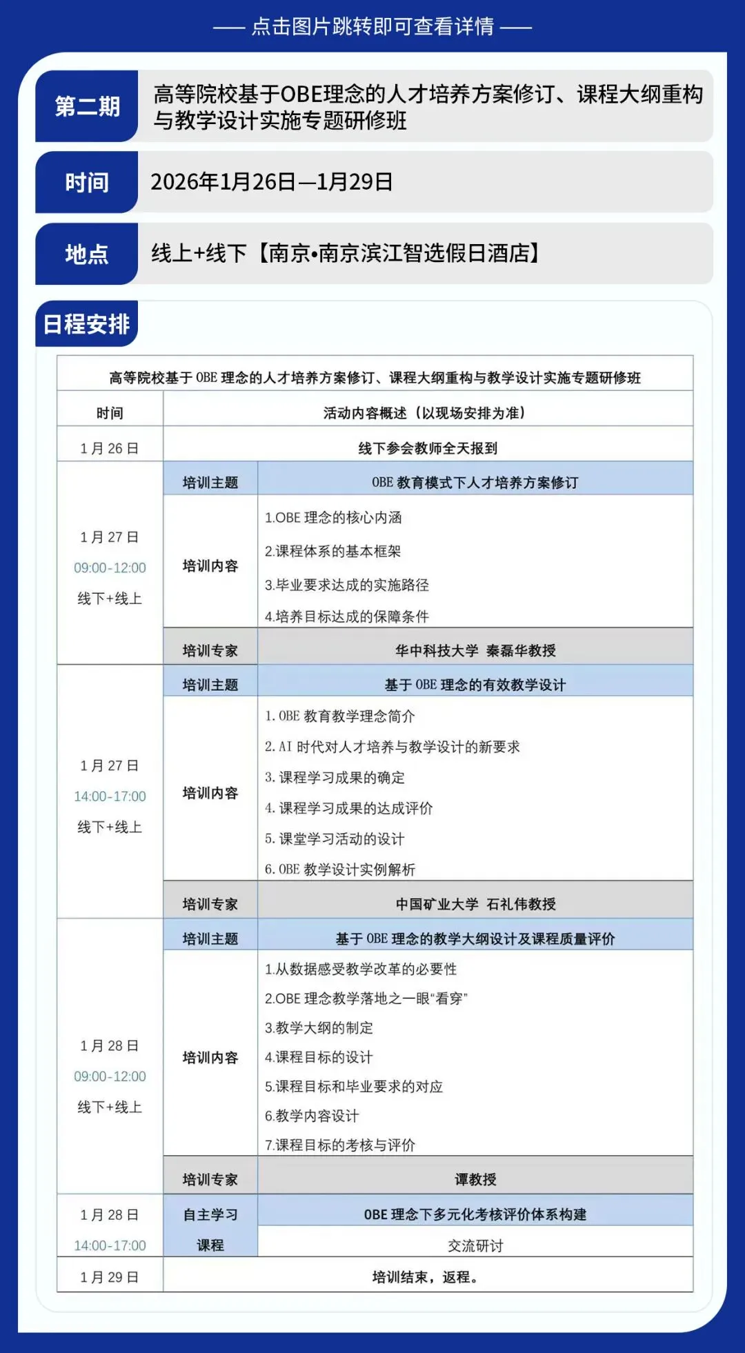 OBE(outcome-based education)是目前高校在“四新”建设、专业建设、教学评估/评价、教学改革等人才培养相关工作中推行融入的主流教育理念和理论体系。学生中心、成果导向、持续改进的教育理念为高校的专业建设、课程建设、质量保障体系建设等实践工作提供了重要的理论支撑和实践指导依据,是高校开展大规模教育教学改革和质量提升的重要抓手。为切实提高教师OBE教学实施能力,解决教师在实施OBE教育教学理念中存在的疑惑,我单位于2026年1月26日—29日在南京市举办《高等院校基于OBE理念的人才培养方案修订、课程大纲重构与教学设计实施专题研修班》,现将相关培训事宜通知如下:
