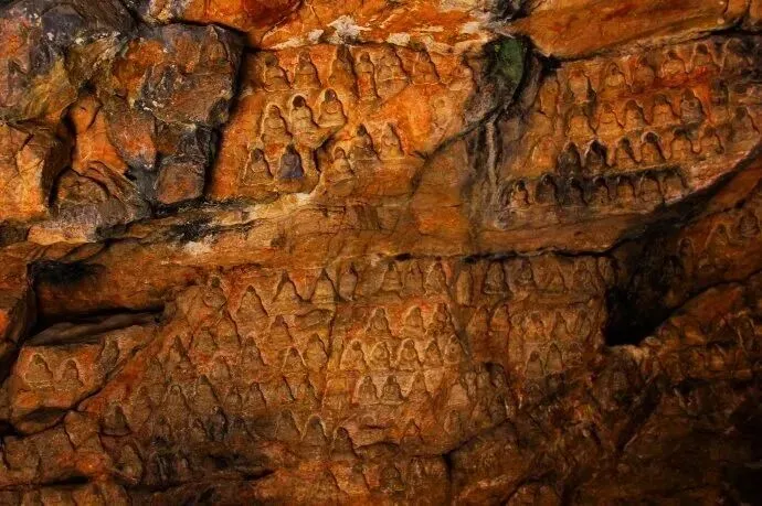 躬身踏入洞内,方寸天地间,尽是历史的印记。洞窟略呈椭圆,东西九丈余,南北十余丈,洞顶高高低低,最高处不过两米,却将千百年的时光尽数容纳。举目四望,洞壁皆是天然断层岩石,昔日匠人便是依着这石质纹理,遍镌佛像。那些高约十厘米的造像,原本该有七八百尊之多,坐佛端庄,立佛肃穆,卧佛悠然,姿态各异。只可惜历经人为破坏,多数佛头已然残缺,断痕处的石色,比周遭更显苍冷。唯有西壁的造像保存稍好,依稀能辨出当年的刀工线条,在光影里静静诉说着往昔的香火鼎盛。