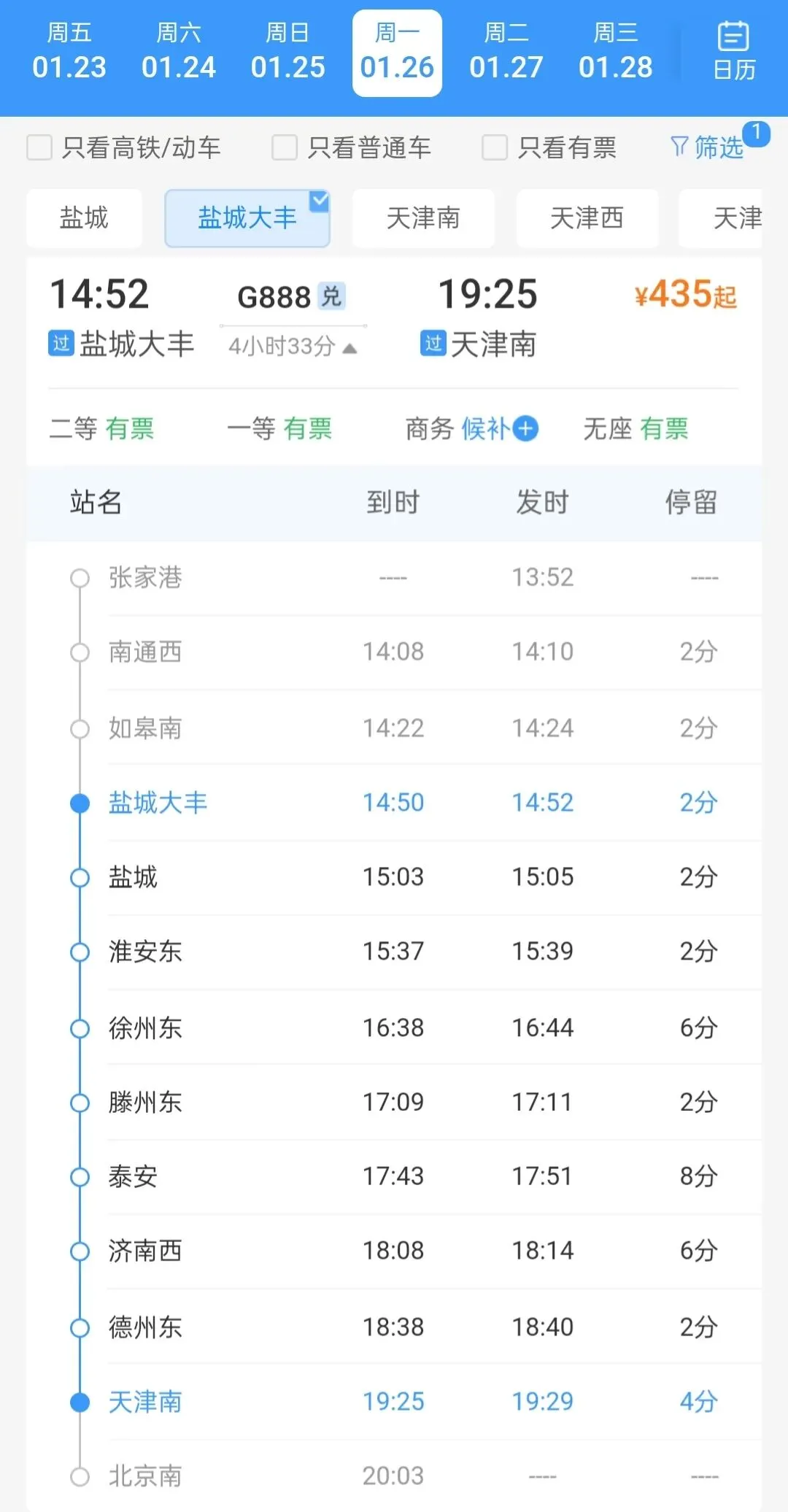 此次调整是在原有线路基础上增加的天津南、淮安东两个站点。