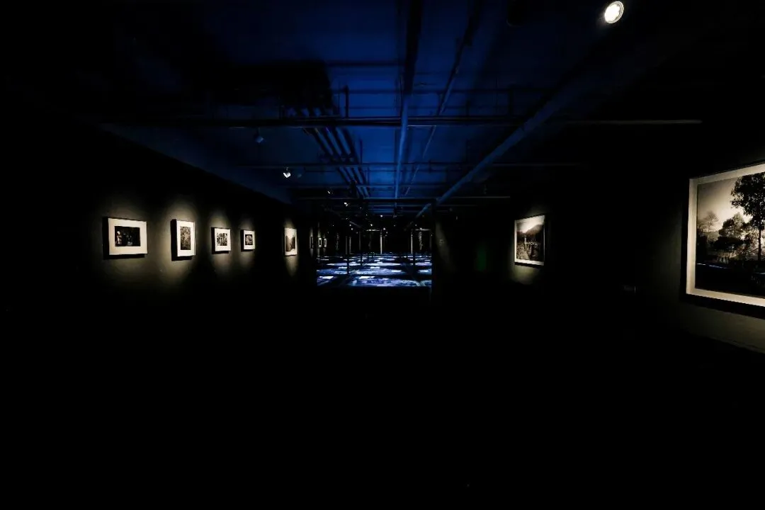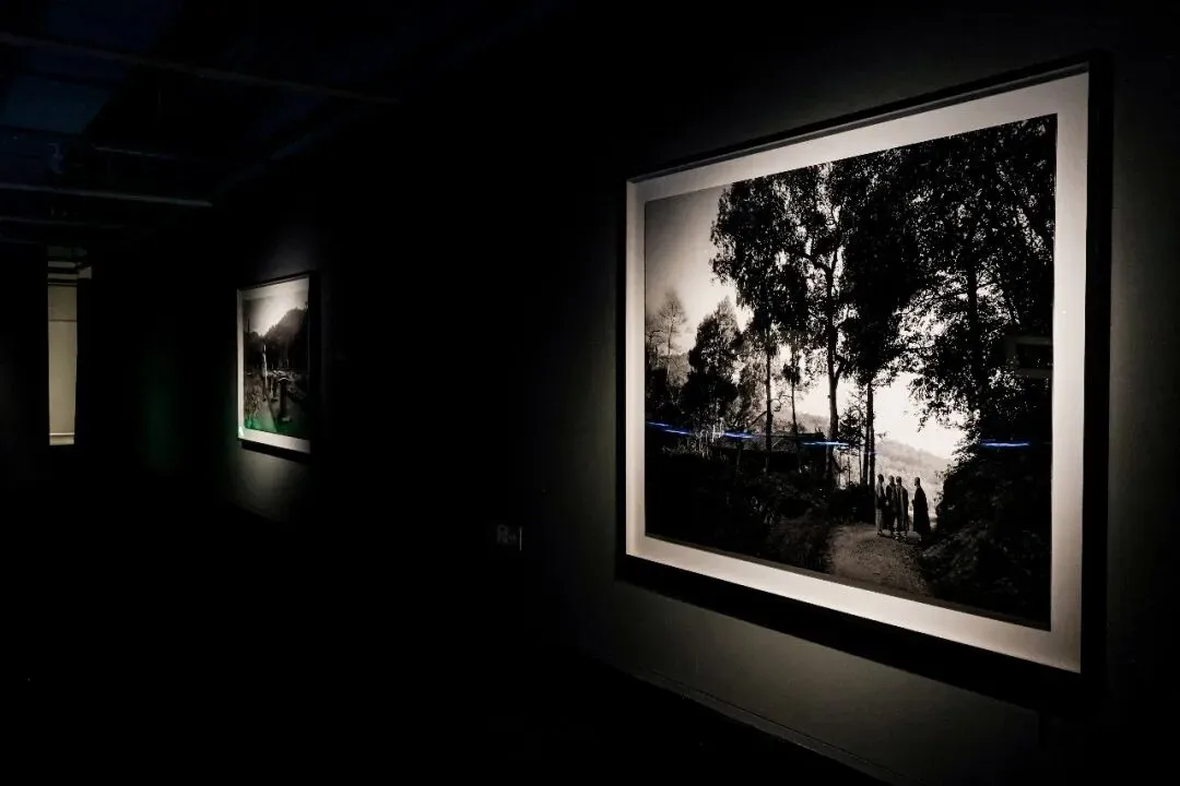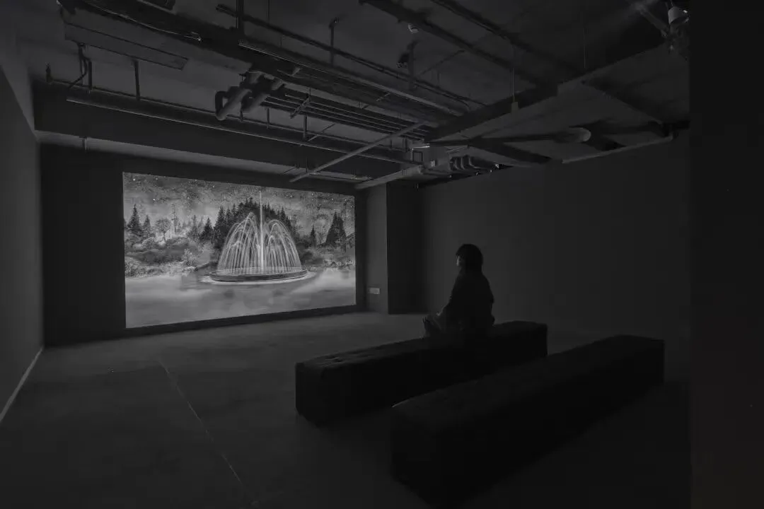 行进至“深境回声”,空间收束为更具围合感的形态,作品的沉思性语汇与静谧空间呼应,引导观者从视觉冲击转向向内沉潜,展览中的作品往往带有文化的重量,无论是隐含着传统与当代叠加的图像,还是追问个体与历史关系的影像,作品并不直接强调叙事的完整性,而是通过象征、隐喻和氛围的营造,将观众引向反思性的状态。如杨福东的《无限的山峰》系列、陈文骥的《涵·九识之一》、王鲁炎的《镜前、镜像者指被镜像者》、汉斯·欧普·德贝克的《Vanishing Point》等作品。