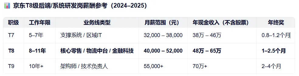 该员工离职前平均月薪 4.1万元,推算出年基本工资49.2万元,年终奖按 4.92万元(1.2个月工资)计算,即年现金总收入≈54.12万元。根据上述对照表,其薪资处于T8职级中低位水平。对于南京大学2014届计算机硕士、9年全周期深耕京东后端或中台系统研发(非核心推荐/广告方向) 的员工而言,完全符合正常标准,甚至略偏保守(若在零售交易核心链路、智能供应链或物流科技高优项目组,同职级月薪普遍达45k–52k,年终奖1.5个月起)。