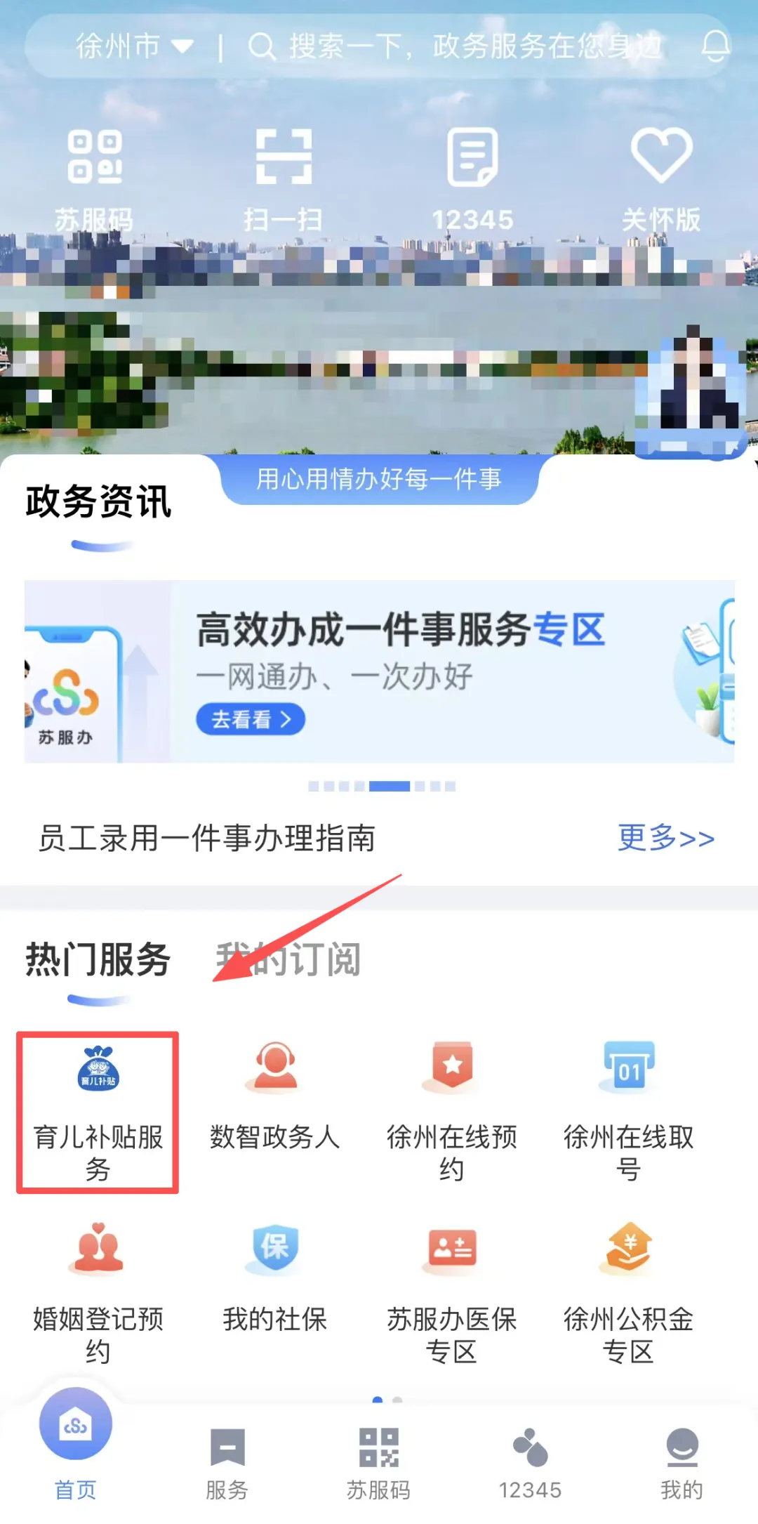 ①打开苏服办(APP、支付宝小程序、微信小程序),在首页找到“育儿补贴”,进入服务。