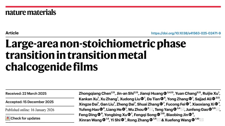 南京大学王学锋教授、张荣教授 Nat. Mater.:过渡金属硫族化合物薄膜中的大面积非化学计量比相变