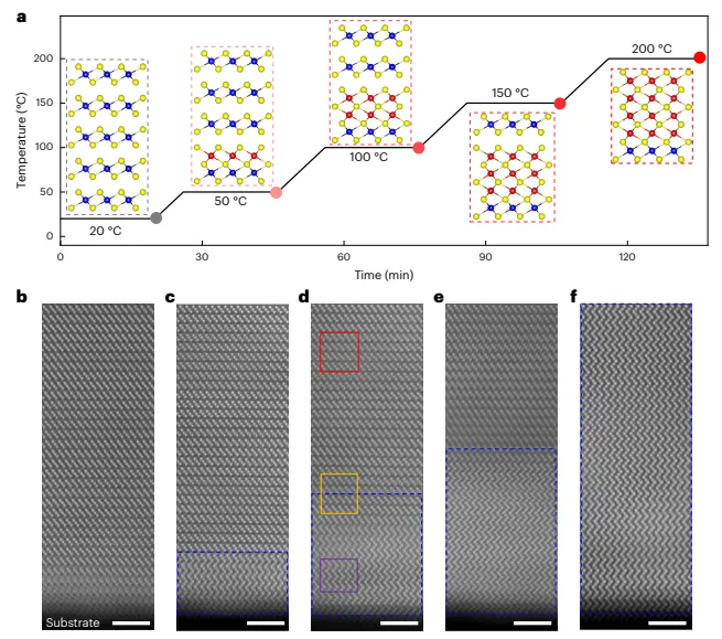 原子级相变观察:通过原位STEM技术,首次在原子尺度上直接观察到大面积过渡金属硫族化合物薄膜中的非化学计量比相变过程,为理解相变机制提供了直接证据。