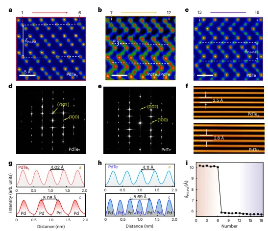 图1 | PdTe2到PdTe的非化学计量相变。a,PdTe2中受热驱动的原子重构示意图。蓝色、红色和黄色球体分别代表Pd原子、占据范德华间隙的Pd原子(Pdv)和Te原子。b,PdTe2到PdTe相变(从状态I到状态V)的能量分布理论模拟。c–g,状态I(c)、II(d)、III(e)、IV(f)和V(g)的COOP计算。右上角数字代表COOP值的放大倍数。水平和垂直虚线分别代表费米能级和零COOP值。图2 | 观测PdTe2到PdTe受热驱动的相变过程。a,展示了PdTe2在20至200°C逐步升温过程中发生的多步相变的温度-时间曲线。升温速率设定为5°C/分钟,达到目标温度后保持20分钟,以确保样品在每个温度下完成相变。插图展示了随着温度升高原子结构的演变。b–f,在20°C(b)、50°C(c)、100°C(d)、150°C(e)和200°C(f)加热温度下,PdTe2到PdTe相变的原位STEM观测结果。深色区域(底部)代表蓝宝石基底。蓝色虚线矩形框表示在不同加热温度下因重构而产生的PdTe区域。比例尺,2纳米。图3 | 晶格膨胀的原子尺度定量显微分析。a–c,分别取自图2d中红色、橙色和紫色矩形标记区域的PdTe2(a)、PdTe2/PdTe异质结构(b)和PdTe(c)的STEM图像快照。连接层内Pd原子的白色虚线展示了Pd原子的演变,用角度α表示。层间交替的Pd原子距离记为δPd–Pd。数字1–18表示从左到右的Pd原子。比例尺,5埃。d,e,PdTe2和PdTe分别来自a(d)和c(e)的相应FFT图像。f,PdTe2(顶部)和PdTe(底部)分别来自d和e的(002)衍射斑点的逆FFT图像。g,h,PdTe2(g)和PdTe(h)沿a轴(顶部)和c轴(底部)的Pd原子相应线轮廓。i,对应于a–c中不同序号Pd原子的δPd–Pd间距的平均量化值。图4 | 通过相位工程增强超导性并产生巨大的螺旋度依赖性太赫兹发射。a,35纳米厚PdTe2、26纳米厚PdTe2/PdTe和20纳米厚PdTe薄膜的归一化电阻随温度的变化。TC定义为正常状态电阻的90%,电阻通过7K时的值进行归一化。插图展示了霍尔棒器件结构的示意图。b,c,PdTe2和PdTe在零磁场和沿c轴方向不同磁场下纵向电阻随温度的变化。d,太赫兹发射测量实验装置的示意图。在PdTe2/PdTe之前放置了四分之一波片,通过改变θλ/4的角度来改变垂直入射激光脉冲的偏振。坐标系(xyz)适用于实验室框架。样品放置在x-y平面,方位角φ相对于y轴表示。e,错配位错缓解晶格失配引起的应变的相变示意图。为了更清晰地突出晶格位错,仅绘制了Pd原子。f,PdTe2晶体结构在拉伸应变下的俯视图。g,在φ=0°时,PdTe2/PdTe、PdTe2和PdTe在右旋圆偏振光(RCP)和左旋圆偏振光(LCP)激发下的螺旋度依赖性太赫兹发射。h,φ=0°和φ=90°时太赫兹峰值幅度随θλ/4的变化,其中实线代表拟合https://doi.org/10.1038/s41563-025-02471-9
