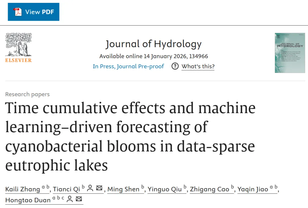 Zhang, K., Qi, T., Shen, M., Qiu, Y., Cao, Z., Jiao, Y., & Duan, H. (2026). Time cumulative effects and machine learning-driven forecasting of cyanobacterial blooms in data-sparse eutrophic lakes. Journal of Hydrology, 134966. https://doi.org/10.1016/j.jhydrol.2026.134966