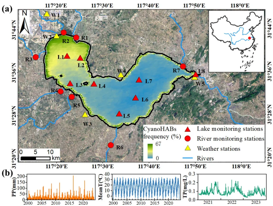 本研究以巢湖为研究区,整合了2000–2023年共23年的多源数据。蓝藻水华数据基于Terra/MODIS卫星影像,采用已有算法提取了蓝藻水华百分比与空间分布数据集。环境变量包括气象数据(温度、风速、日照时数、相对湿度、降水、气压)与水质数据(总氮、总磷、氮磷比、pH、溶解氧),来源于中国气象局与安徽省巢湖管理局。