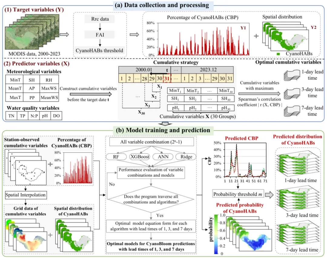 然而,机器学习预测仍面临两大挑战:一是如何有效构建预测变量。现有研究多使用环境变量的瞬时值,忽视了其对蓝藻生长的累积与滞后效应;二是如何实现高精度的空间分布预测。传统方法在平衡计算可行性与空间异质性表征方面存在不足,遥感方法易受云层干扰,气象再分析数据则空间分辨率较低。针对这些挑战,本研究以长期遭受蓝藻水华困扰的巢湖为案例,构建了一个融合时间累积效应与空间插值技术的机器学习预测框架,旨在实现蓝藻水华百分比与空间分布的多时段精准预测。