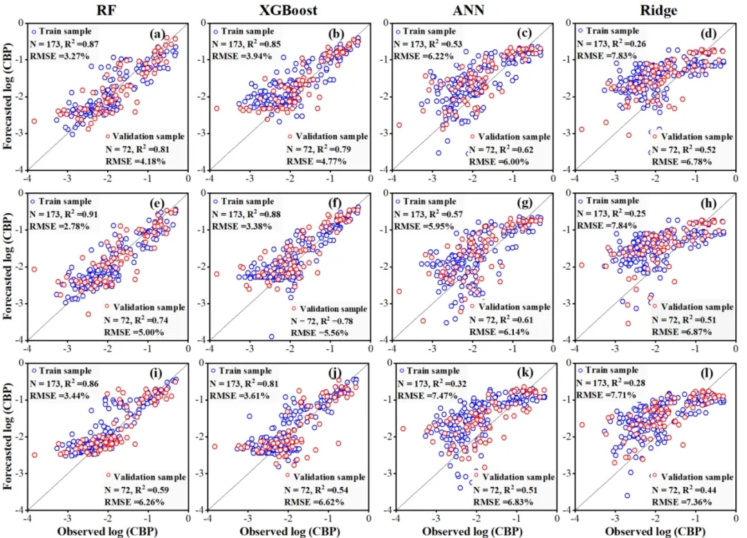 图4 RF、XGBoost、ANN及岭回归模型在训练集与验证集上1天(a-d)、3天(e-h)及7天(i-l)预测精度对比