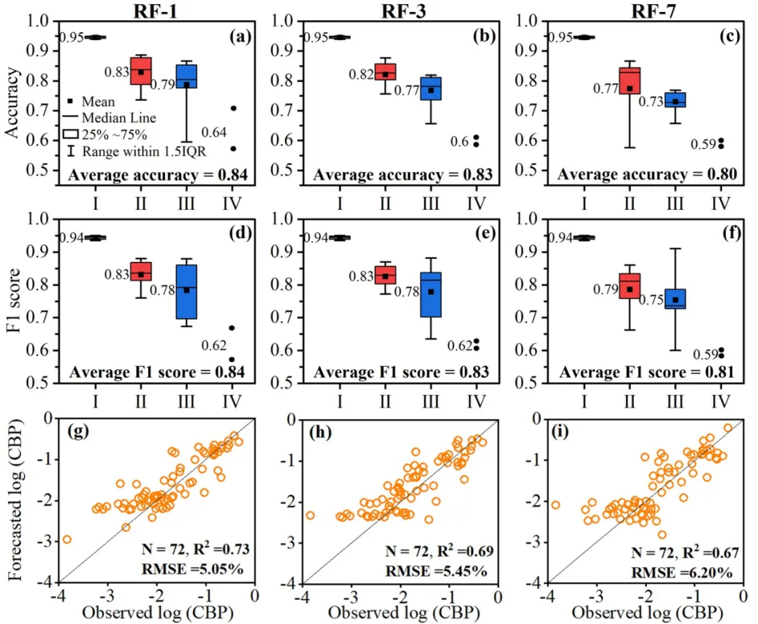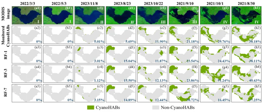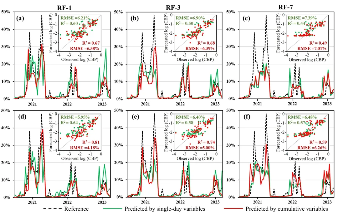 在蓝藻水华百分比预测方面,随机森林模型在1天预测中表现最优(决定系数=0.81,均方根误差=4.18%),其性能随预测时长增加而逐渐下降。与使用单日变量相比,引入时间累积变量使1天预测的决定系数提升26.56%,显著提高了预测精度。融合气象与水质数据的模型预测效果优于仅使用气象数据的基线模型,表明水质监测对预测具有增量价值。