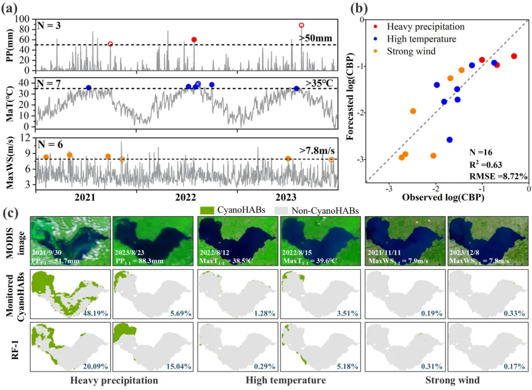 在极端天气情景下(强降水、高温、大风),模型仍保持较好的预测稳定性(决定系数=0.63),能够捕捉降水后水华萌发、高温对水华的抑制效应以及强风对水华的驱散作用,体现了框架在气候胁迫情景下的应急响应潜力。