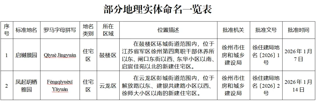 徐州市民政局发布《关于市区部分地理实体命名的公告(2026第2号)》,根据国务院《地名管理条例》有关规定,经市住房和城乡建设局批准对启樾景园、凤起玥栖雅园进行命名,报送市民政局备案,现予以公告。来源:徐州新闻