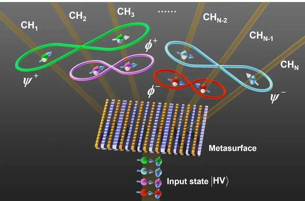 南京大学物理学院王牧教授和彭茹雯教授研究团队在利用超构表面实现量子纠缠调控方面取得重要进展,利用多通道超构表面中双光子量子干涉效应,实现四种贝尔态的构建与全通道组合的纠缠分发。该研究表明,当非纠缠、偏振正交的双光子入射到多通道介质超构表面时,它们在超构表面上发生偏振转换和量子干涉;通过在任意两个输出通道进行后选择获得偏振纠缠态,实现所有通道组合的纠缠分发。