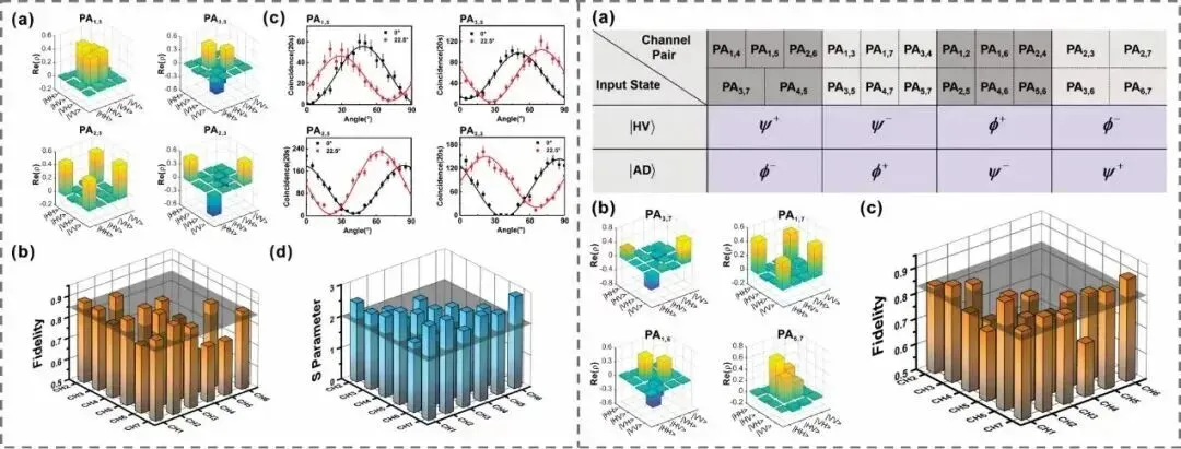 图2 实验制备的硅超构表面SEM图以及单光子实验结果实验上,该团队利用微纳加工制备出尺寸约为400 μm × 400 μm的硅纳米结构超构表面,可产生7个独立输出通道。单光子测量结果(图2)表明,每个通道均具备偏振转换能力。进一步地,将非纠缠且偏振正交的双光子对入射至该超构表面,7个输出通道形成总共21种通道组合,分别对应4种贝尔态。对全部组合进行的量子态层析展示重构密度矩阵,表明具有高保真度,并且CHSH 不等式违背和偏振干涉测量(详见图3中的左图)均验证了光子对在每一通道组合中具有明确的偏振纠缠特性。结果表明,单块百微米尺度的超构表面即可实现四种贝尔态的构建与全通道组合的纠缠分发,为量子网络的紧凑化与集成化提供了有效路径。