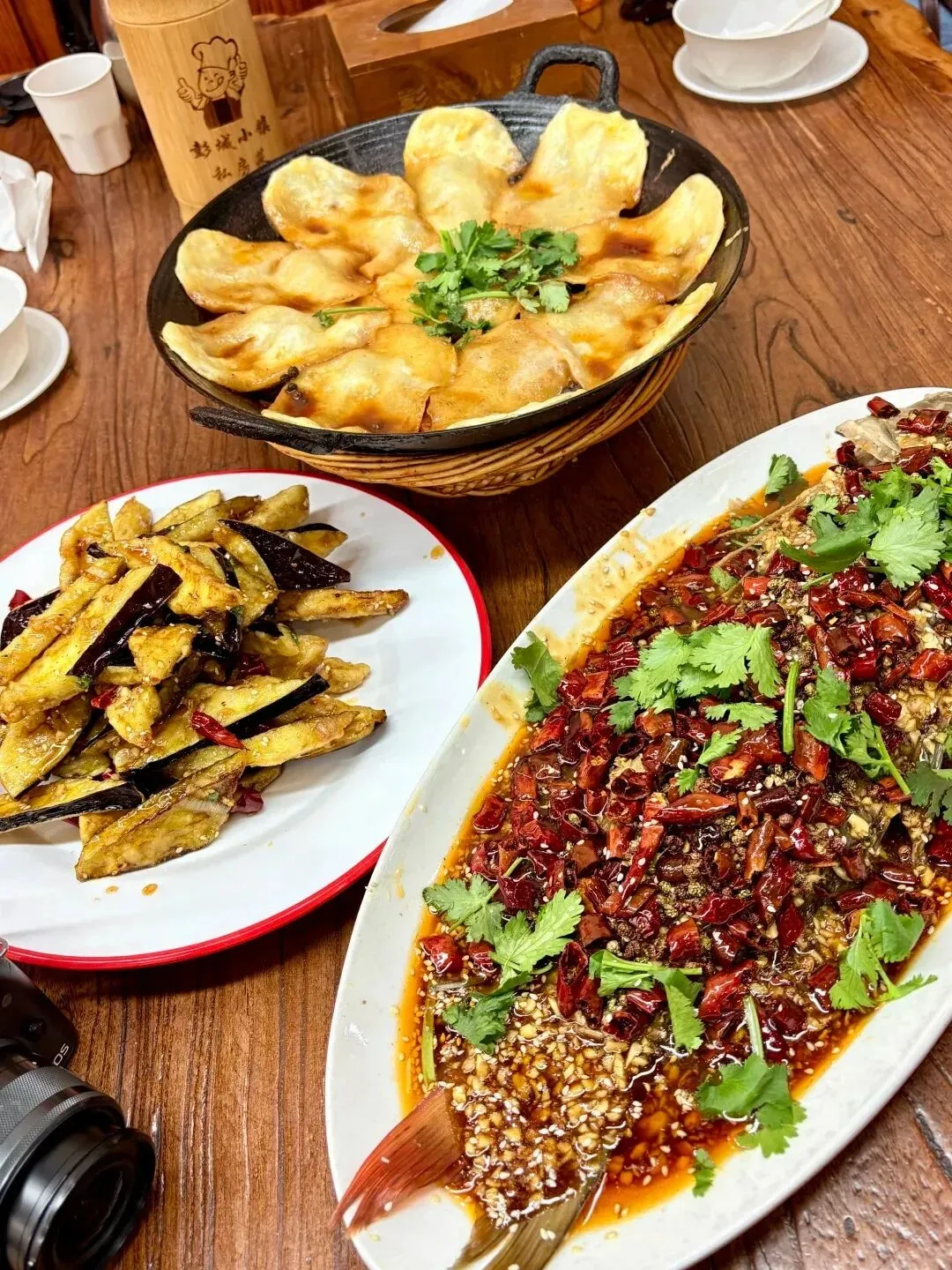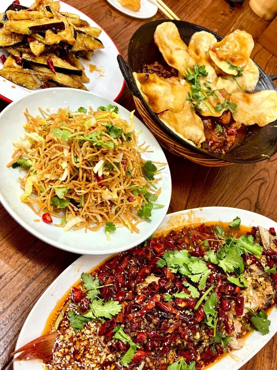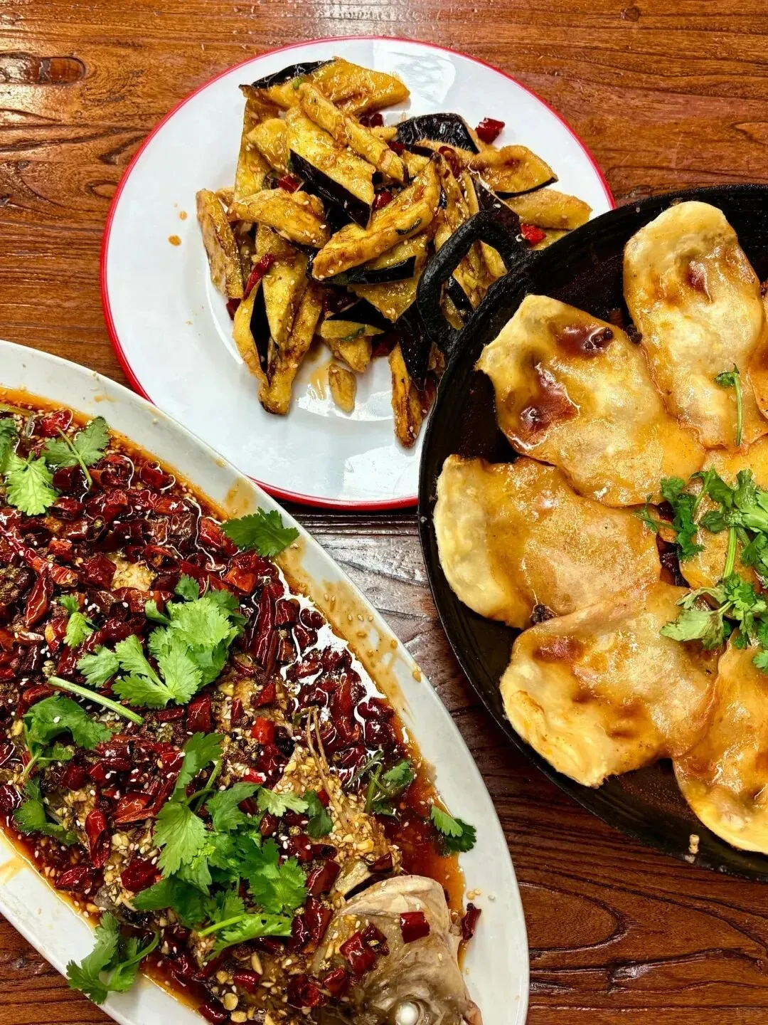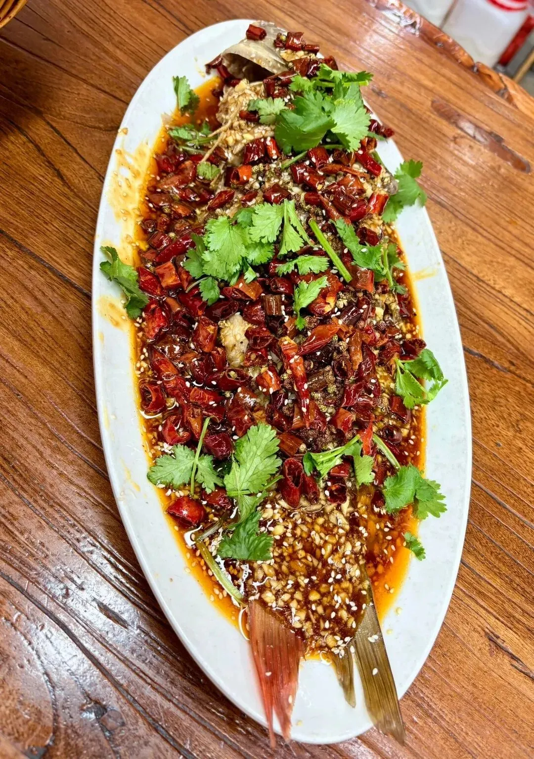 如果说地锅鸡是温厚,那么那道覆满红椒与蒜泥的鲜鱼则是极致的狂欢。大量的干辣椒与芝麻在热油的催发下,释放出极具侵略性的香气。鱼肉细嫩如丝,在鲜辣的包裹中依然保持着原始的甘甜。