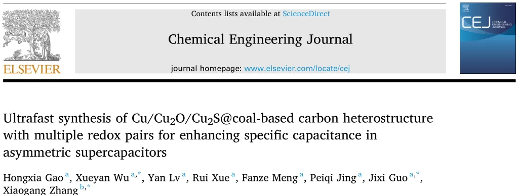 Hongxia Gao, Xueyan Wu, Yan Lv, Rui Xue, Fanze Meng, Peiqi Jing, Jixi Guo, Xiaogang Zhang. Ultrafast synthesis of Cu/Cu2O/Cu2S@coal-based carbon heterostructure with multiple redox pairs for enhancing specific capacitance in asymmetric supercapacitors. Chemical Engineering Journal, Volume 528, 2026,172716, ISSN 1385-8947. https://doi.org/10.1016/j.cej.2026.172716.