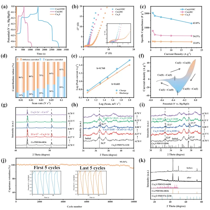南京航空航天大学张校刚教授及新疆大学郭继玺教授、吴雪岩教授团队提出了一种通过低温预氧化策略和快速焦耳热处理相结合的方法,制备出具有多价态的铜基复合材料电极。研究团队首先对煤基碳材料进行低温预氧化处理,引入丰富的含氧官能团,为铜基化合物的均匀锚定提供了理想的活性位点。随后,通过快速焦耳热处理,成功构建了铜/氧化铜/硫化铜异质结构,并与碳基底紧密结合。这种异质结构不仅促进了电解液离子的吸附和扩散,还通过多价态铜的氧化还原反应显著提升了电极的赝电容性能。实验结果表明,优化后的电极在三电极体系中展现出高达2041 F/g的比电容,并在组装成非对称超级电容器后,实现了60.01 Wh/kg的能量密度和800 W/kg的功率密度,同时在10000次循环后容量保持率达97.29%。本研究为高性能超级电容器电极材料的设计提供了新的思路,也为解决铜基材料团聚问题提供了有效的解决方案。