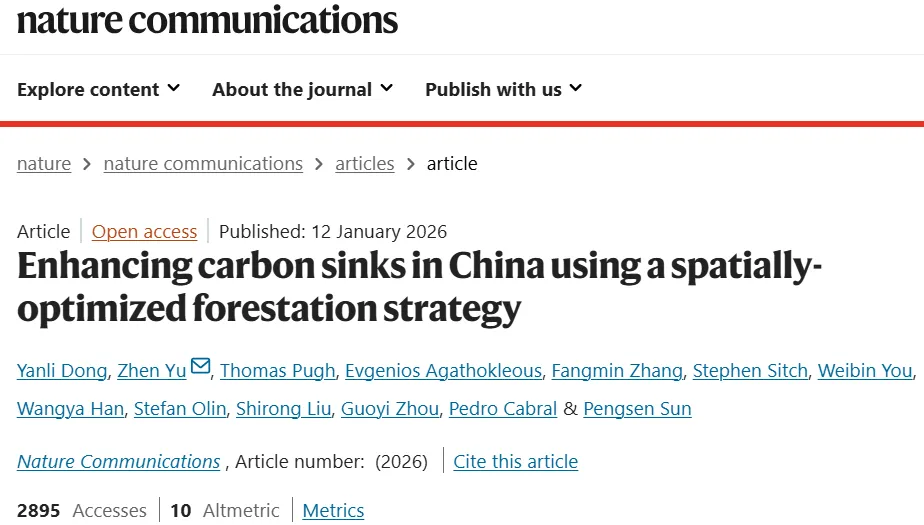 论文信息:Yanli Dong, Zhen Yu*, Thomas Pugh, Evgenios Agathokleous, Fangmin Zhang, Stephen Sitch, Weibin You, Wangya Han, Stefan Olin, Shirong Liu, Guoyi Zhou, Pedro Cabral & Pengsen Sun. Enhancing carbon sinks in China using a spatially-optimized forestation strategy. Nature Communications (2026). https://doi.org/10.1038/s41467-026-68288-5