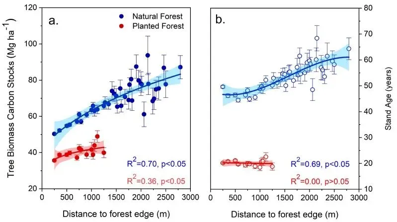 大规模造林是应对气候变化、实现“碳中和”国家战略的重要且基于自然的解决方案。现有的造林碳汇评估研究往往仅关注造林面积的扩张和气候因子的影响,却忽视了森林景观格局变化,尤其是“边缘效应”所带来的重要影响。由于人为干扰形成的森林边缘通常面临更强的风害、干旱胁迫、病虫害以及人类活动压力,导致树木死亡率增加、生物量碳密度显著低于内部森林。若忽略这一机制,将影响森林碳储量预估结果的准确性。
