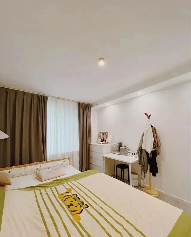 床尾这一小块地方 , 书桌、斗柜、衣架 , 全安排上了 , 但一点不挤 , 动线还顺 , 这规划真的值得抄作业。