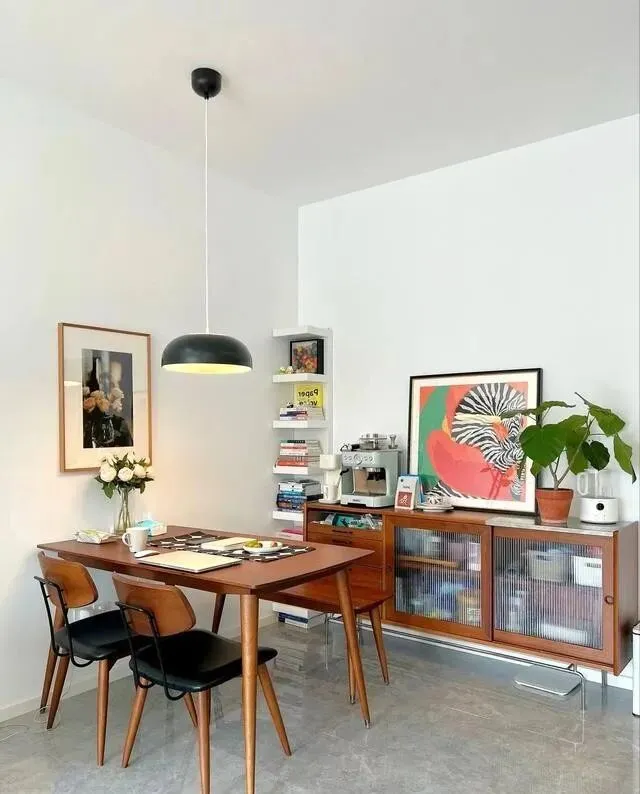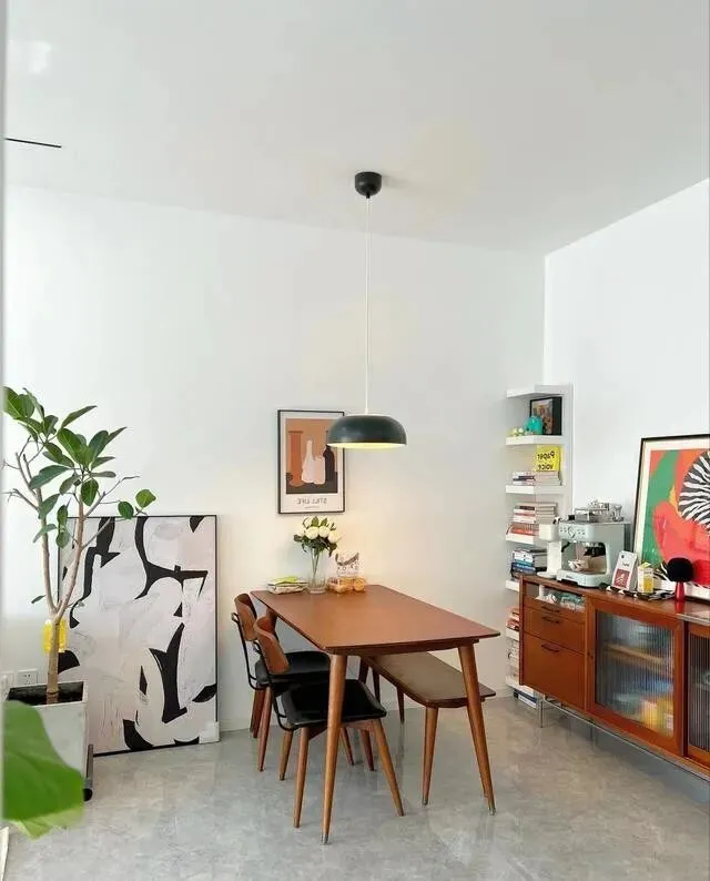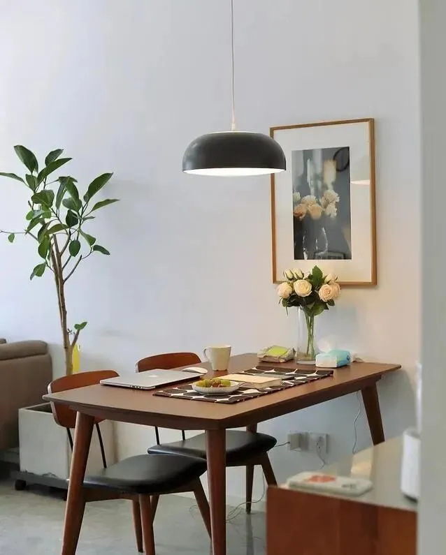 头顶挂了一盏黑色锅盖吊灯 , 造型有点复古 , 光打下来刚刚好 , 不刺眼 , 氛围感直接拉满。