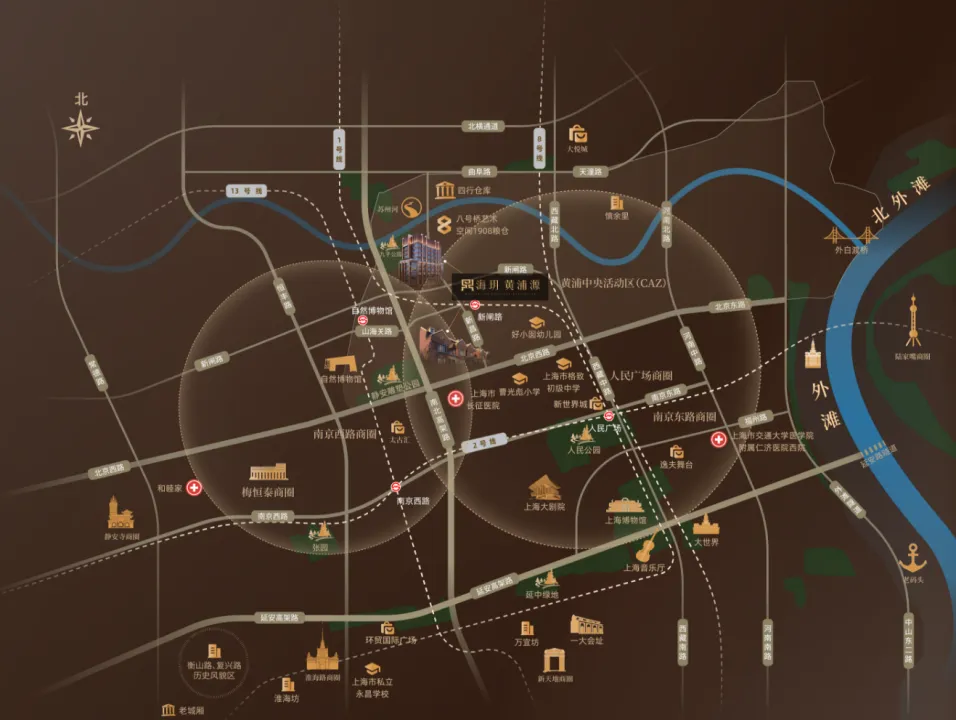以人民广场为圆心,高浓度资源向外辐射开来,这里是一切繁华的坐标原点。海玥黄浦源直线距离人民广场仅约1.2千米(来源:高德地图),北面紧邻苏河湾、南面紧邻南京东路、人民广场商圈,西面静安雕塑公园,东面外滩和黄浦江,位居城市这颗跳动的“心脏之巅”!区位图仅为概念示意展示,仅供参考