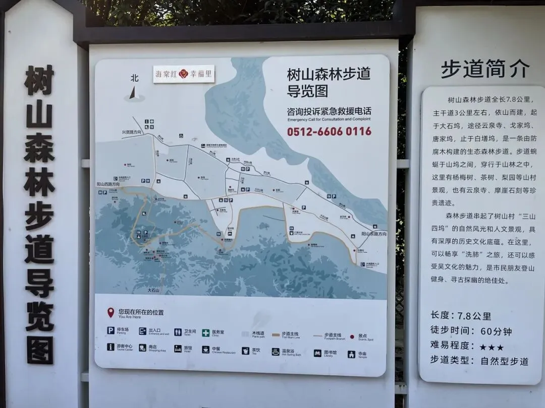自驾导航目的地:苏州树山生态村(树山党群众服务中心)。停车是4小时内5块钱,基本上爬完小环线,回到停车场的地方,4小时内足够。