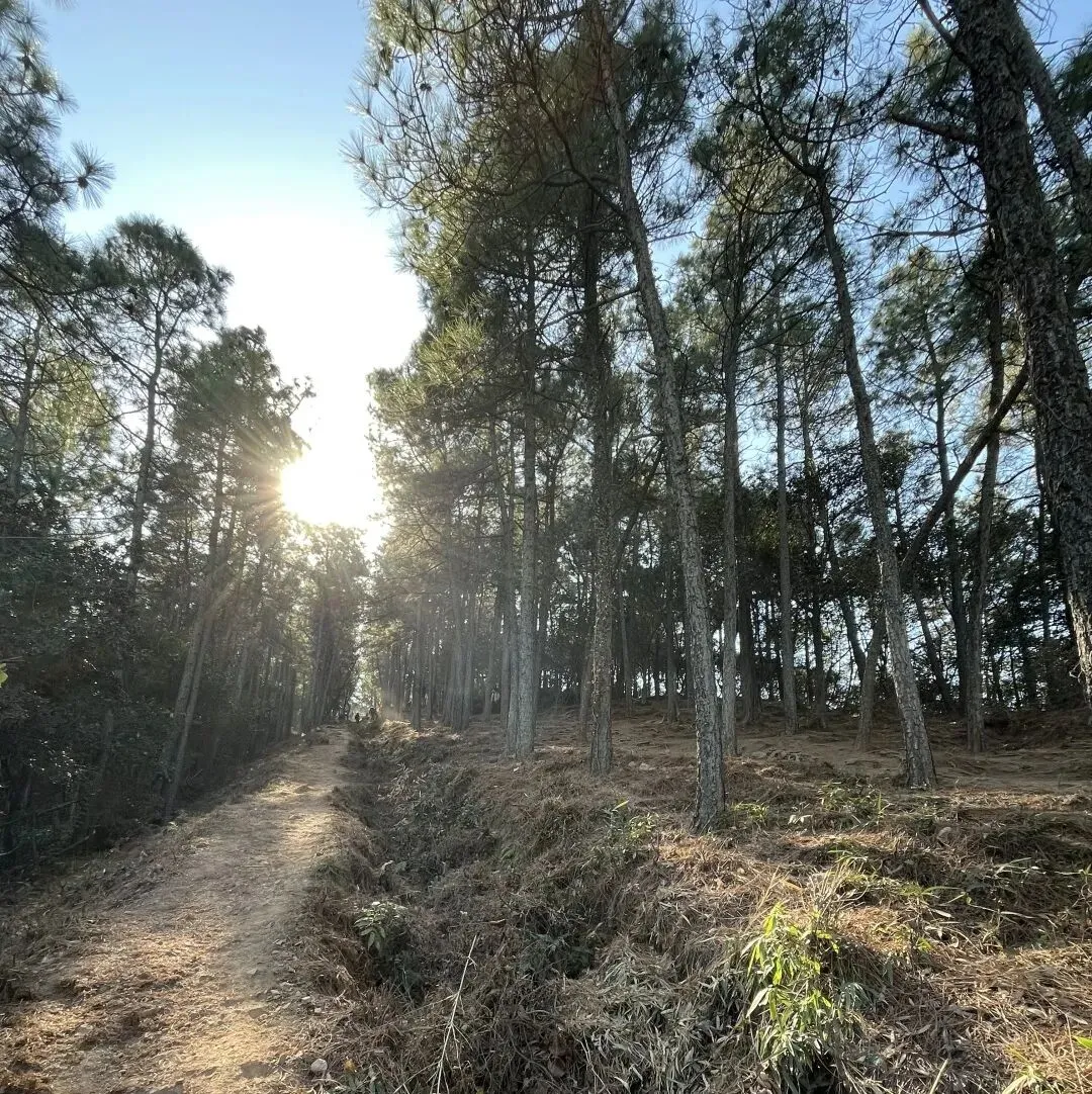 到达第二座山峰的顶部之后,继续往前走,就是出山了,可以看到一条环形的马路。如果要走山路去翡翠湖,可以往马路的右手边走。遇到一个有小道的口子,就是下山的路线了。不过,为了保险起见,可以问问其他人,以免错过道口。小道口边还有卖东西的,也可以问问老板。