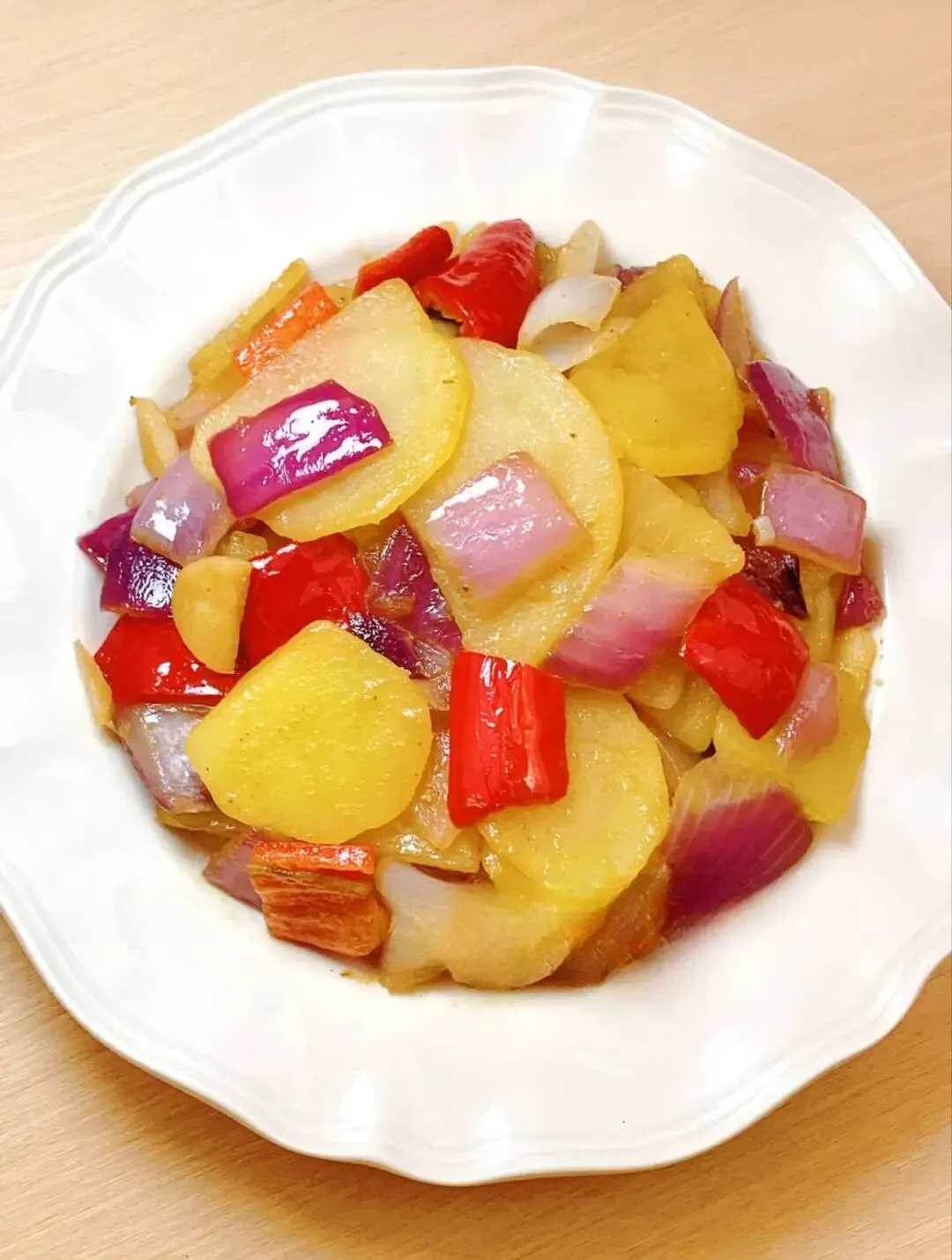 彩椒洋葱土豆片、菠菜鸡蛋汤