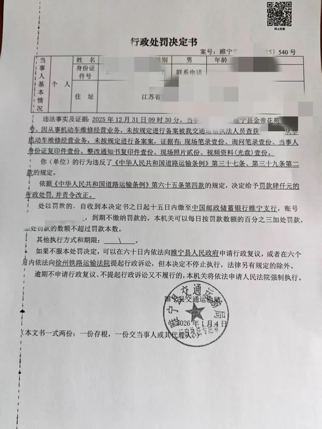 依据《中华人民共和国道路运输条例》,睢宁县交通运输局对其处以4000元罚款,并责令其立即停止违法经营。