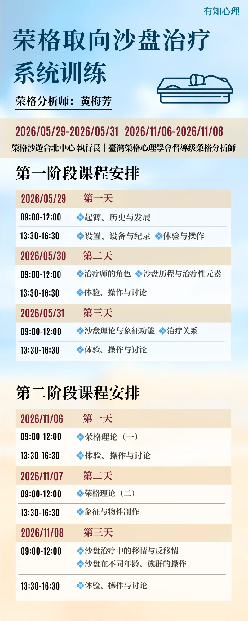 也正因如此,我们特别邀请黄梅芳老师,开展此次荣格取向沙盘游戏治疗连续培训(2026-2027)。培训的主旨也是为了回应这一临床需要。它并不以「快速掌握方法」为目标,而是邀请学员在一个连续、稳定的学习框架之中,真正理解沙盘何以成为治疗,以及治疗师在其中应当如何在场。