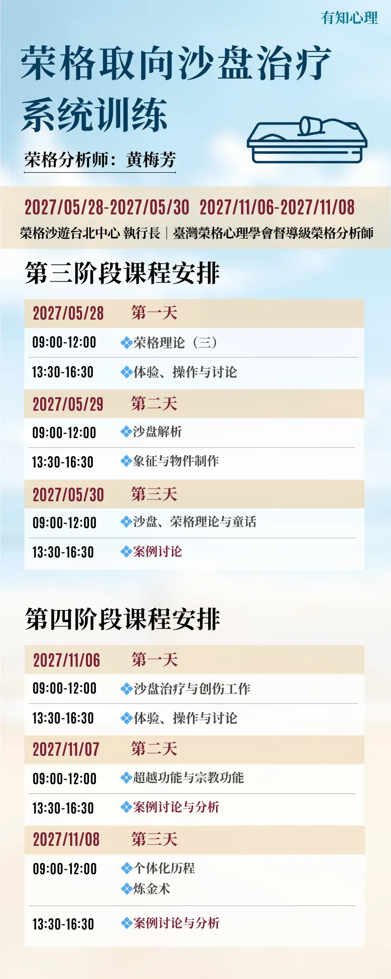 黄梅芳老师是国际分析心理学会荣格分析师,现任台湾荣格心理学学会秘书长和台湾心理治疗学会理事,在分析心理学实践和沙盘游戏实践方面有着丰富的经验。本培训将通过理论讲解、实务演练和案例督导等形式,帮助学员逐步形成荣格取向沙盘的整体视角。