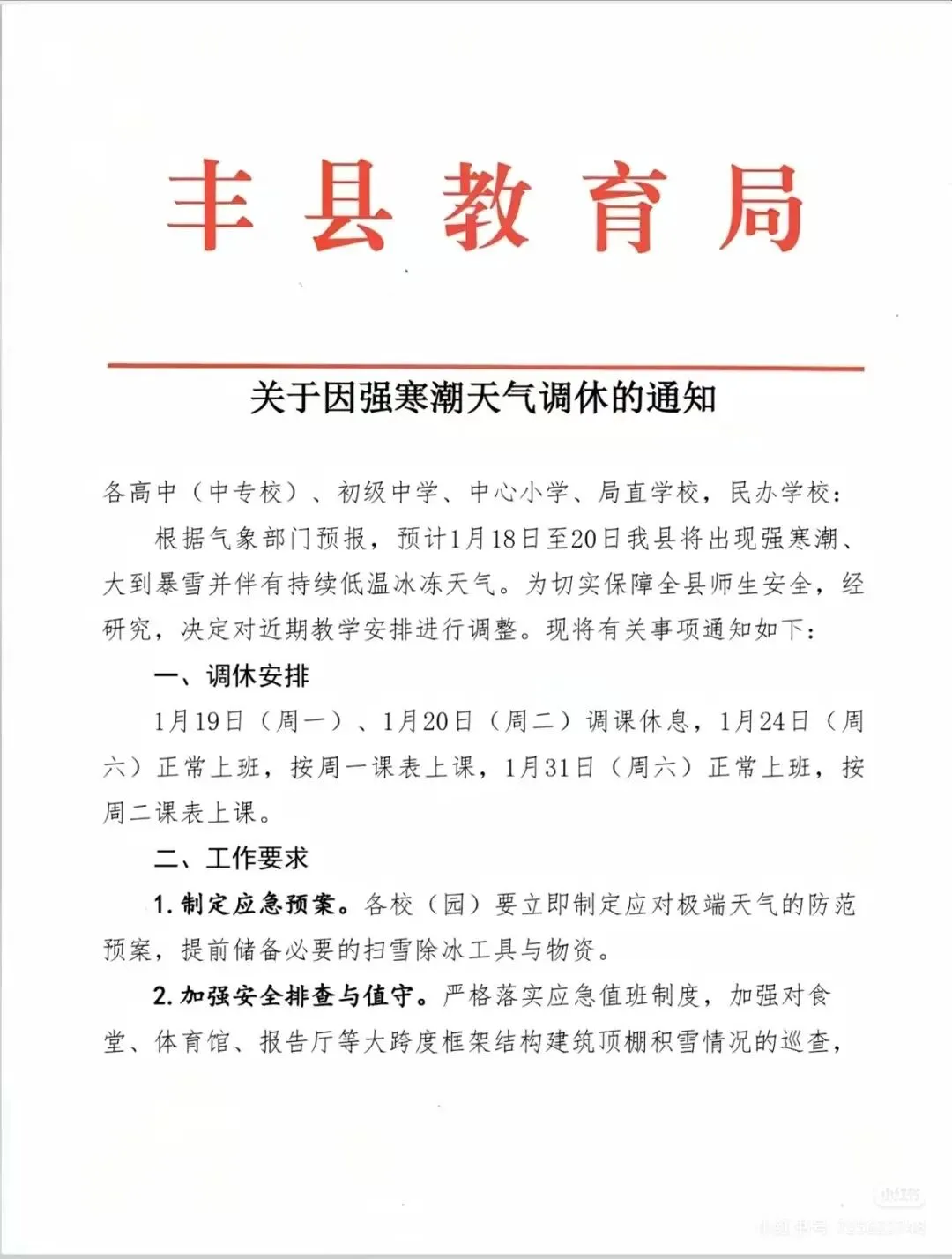 就在刚刚,丰县官宣:因为18号到20号的强寒潮和大暴雪,全县中小学、幼儿园1月19日(周一)、20日(周二)直接调休停课,后面两个周六(24号、31号)再补回来。
