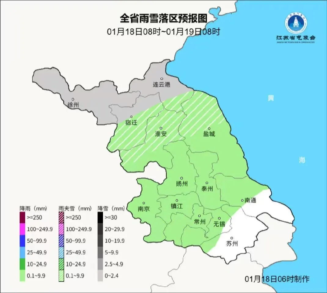 1月18日08时至1月19日08时,白天淮北地区多云转阴有小雨,其他地区多云到阴;夜里沿淮和淮北地区阴有小雨转小雨夹雪或小雪,本省东南部地区多云到阴,其他地区阴有小雨。今天最高温度:苏南地区15℃左右,沿淮和淮北地区8~9℃,其他地区12~13℃;明晨最低温度:淮北地区-2~-3℃,沿江和苏南地区5℃左右,其他地区2~3℃。全省东到东北风4-5级,夜里逐渐增强为5级阵风6-7级。
