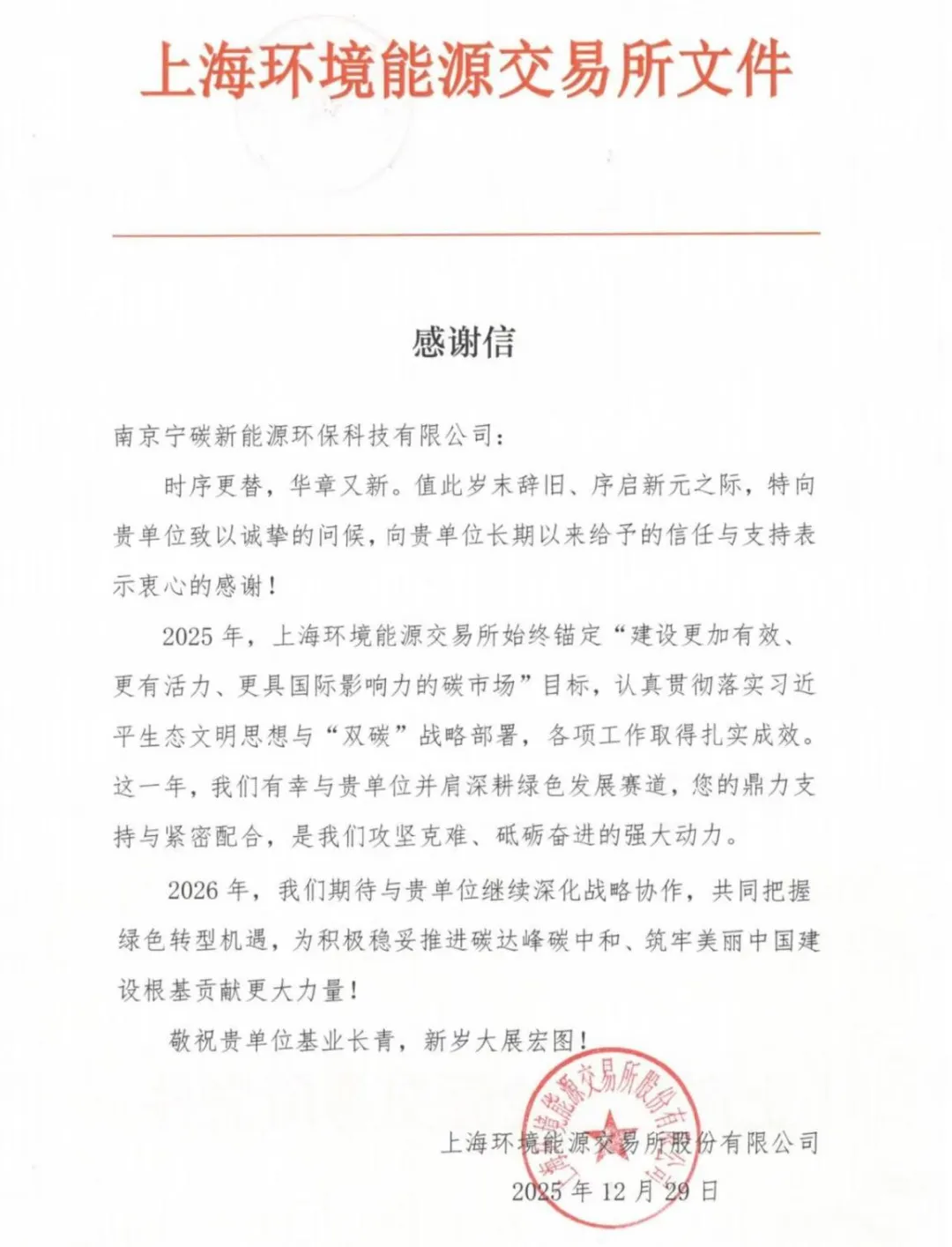 近日,南京宁碳新能源环保科技有限公司收到来自上海环境能源交易所的感谢信。信中,上海环交所对南京宁碳在过去一年中给予的信任与支持表示衷心感谢,并对双方在绿色低碳领域的紧密合作予以充分肯定。