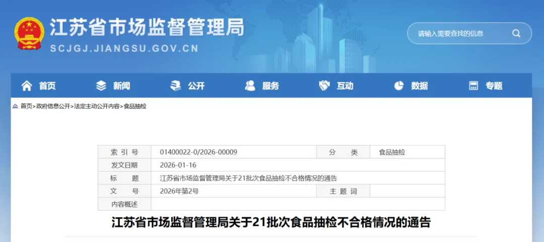 近期,江苏省市场监督管理局组织食品安全抽检,抽取酒类、粮食加工品、肉制品、食用农产品、食用油、油脂及其制品、蔬菜制品、糖果制品、特殊膳食食品、特殊医学用途配方食品、饮料、餐饮食品、炒货食品及坚果制品、蛋制品、糕点及罐头等15大类食品1278批次样品,检出其中餐饮食品、炒货食品及坚果制品、糕点、酒类、粮食加工品、食用农产品、食用油、油脂及其制品、饮料等8大类食品21批次样品不合格,详细信息见附表。