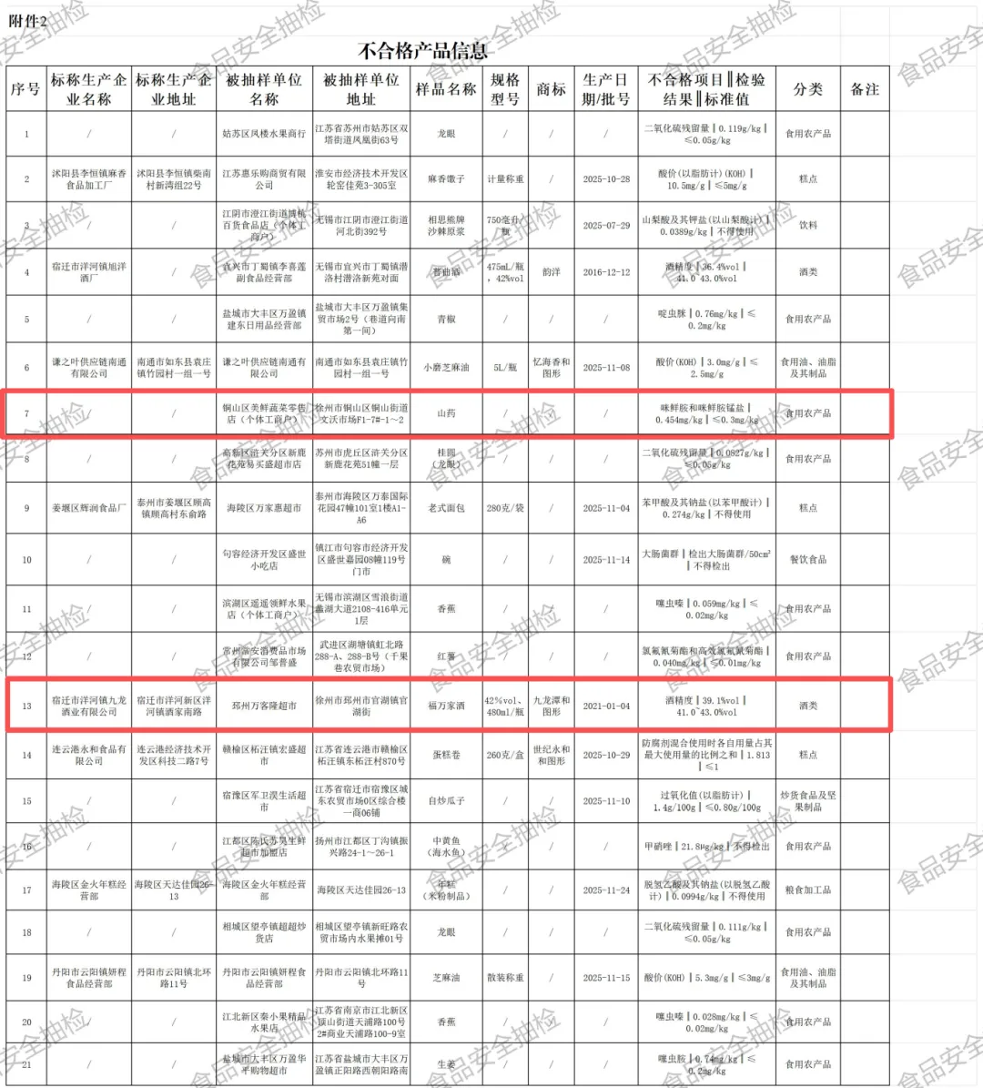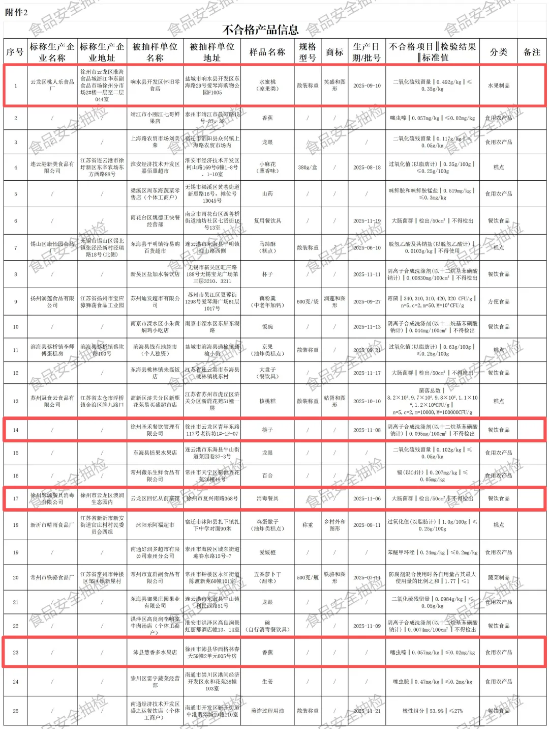 近期,江苏省市场监督管理局组织食品安全抽检,抽取饼干、餐饮食品、炒货食品及坚果制品、豆制品、方便食品、糕点、酒类、粮食加工品、肉制品、乳制品、食糖、食用农产品、蔬菜制品、薯类和膨化食品、水果制品和饮料等16大类食品1699批次样品,检出其中餐饮食品、方便食品、糕点、食用农产品、蔬菜制品及水果制品等6大类食品25批次样品不合格,详细信息见附表。