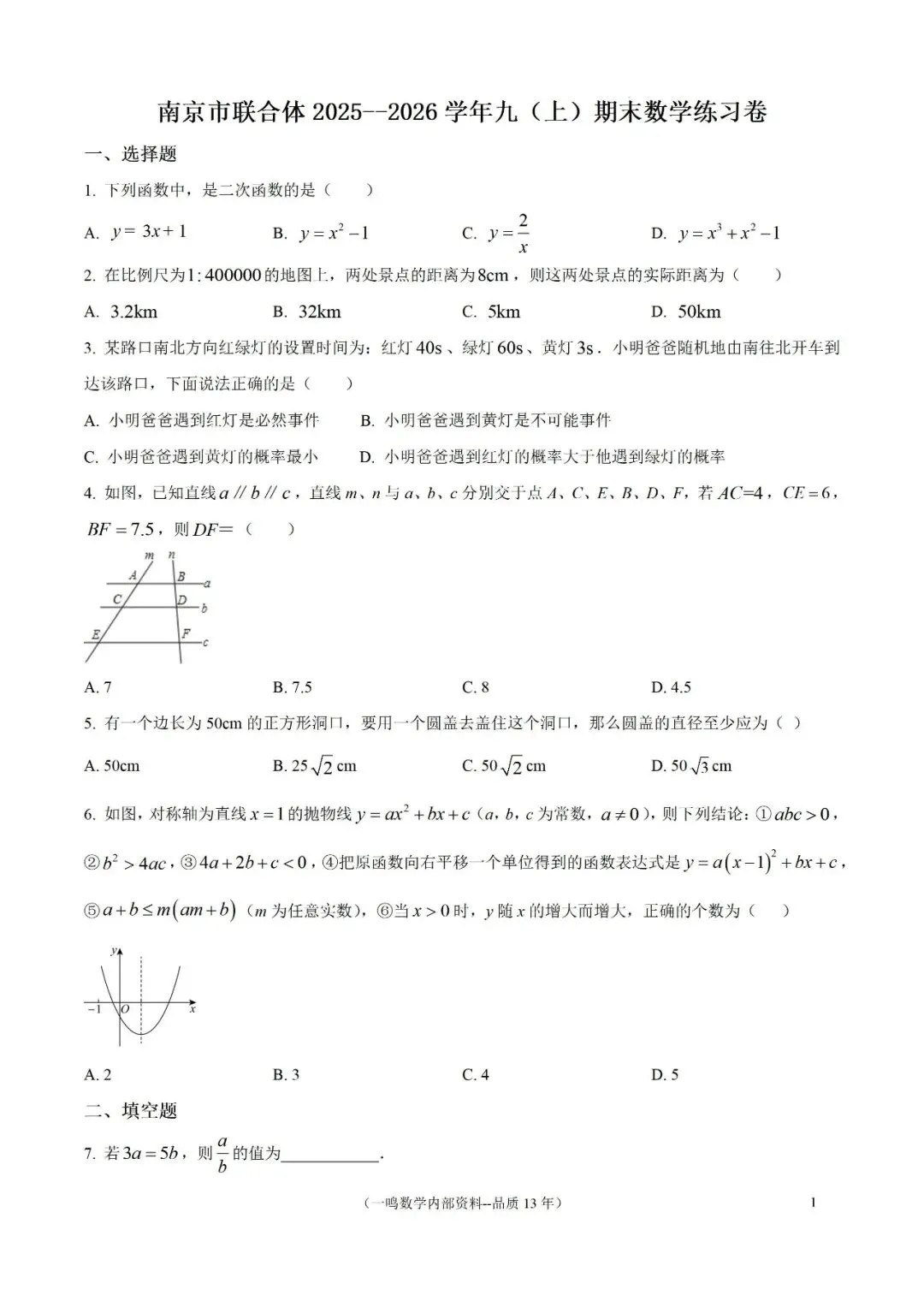 南京市联合体2025--2026学年九年级上学期期末数学练习卷