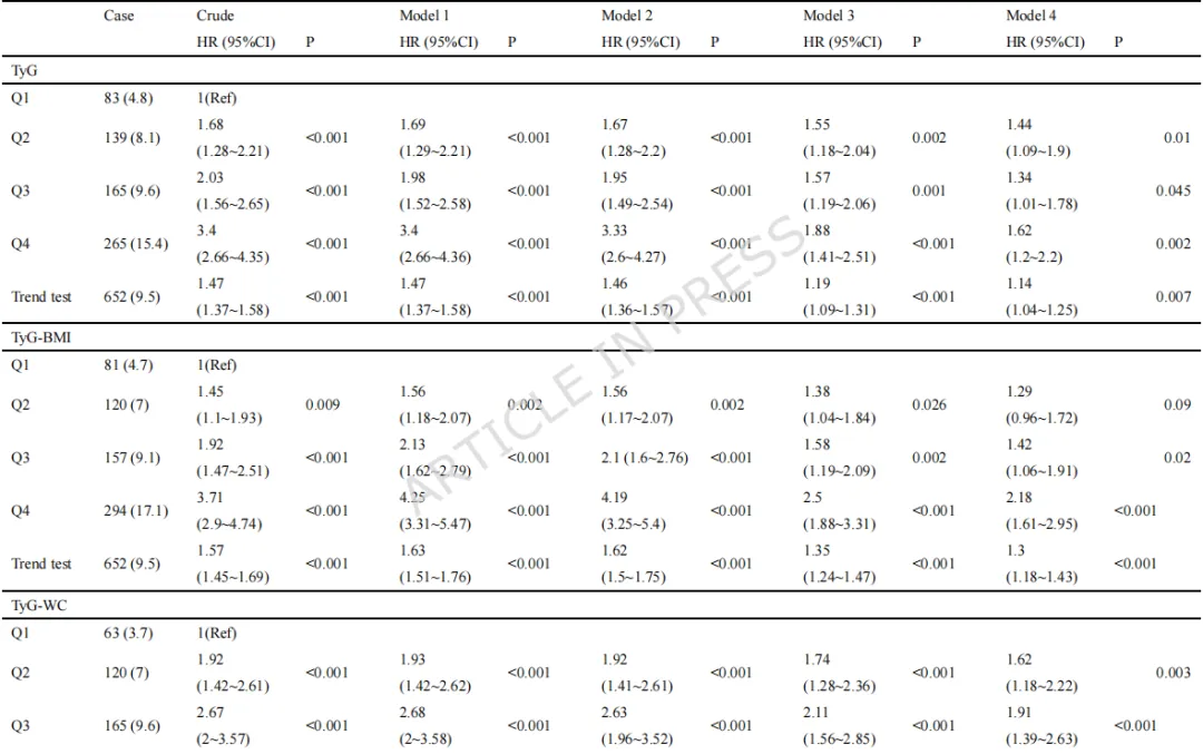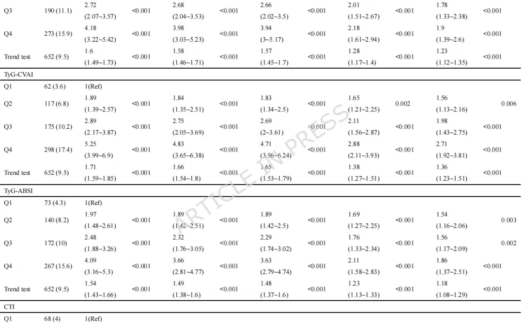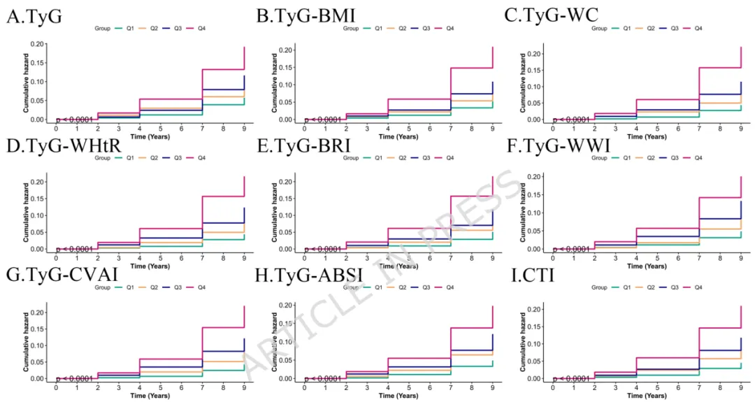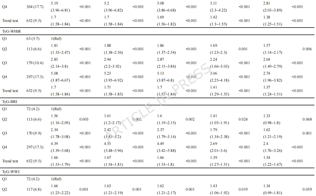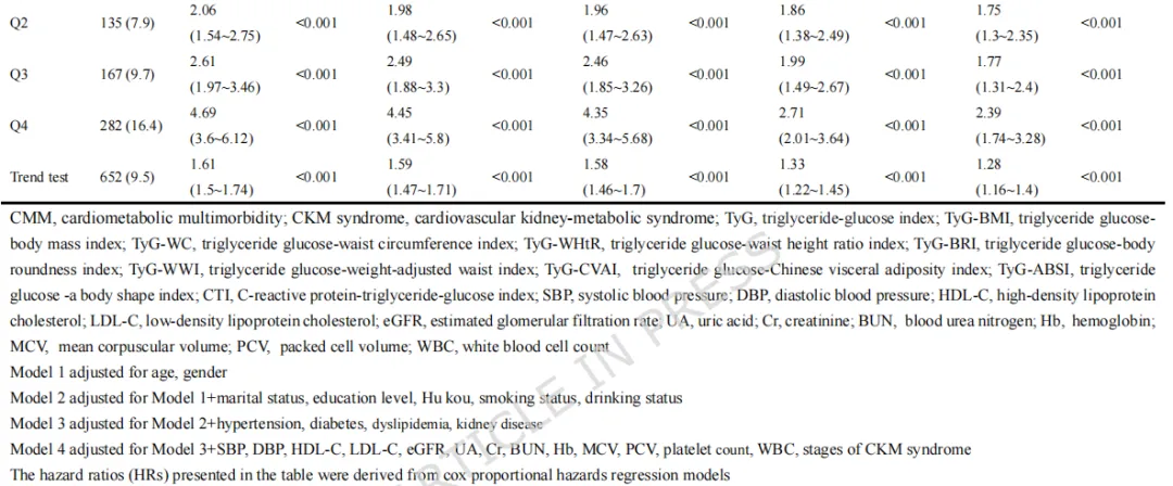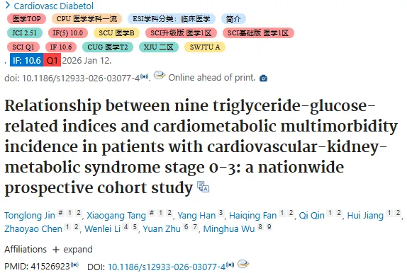 标题:心血管肾代谢综合征0-3期患者中九项甘油三酯-葡萄糖相关指标与心血管代谢多病发生率的关系:一项全国性前瞻性队列研究