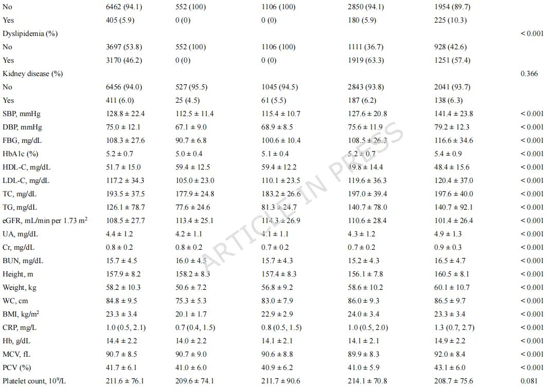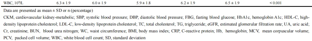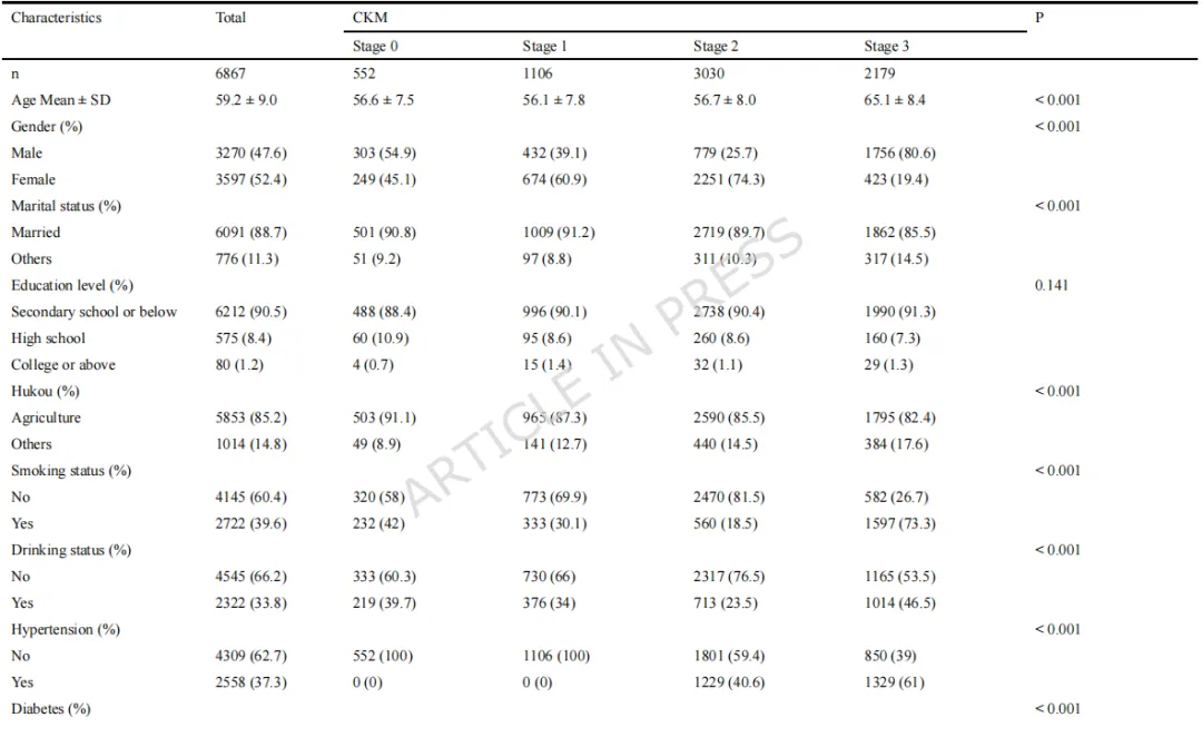 表1 基于心肾代谢综合征0-3期的6,867名参与者特征