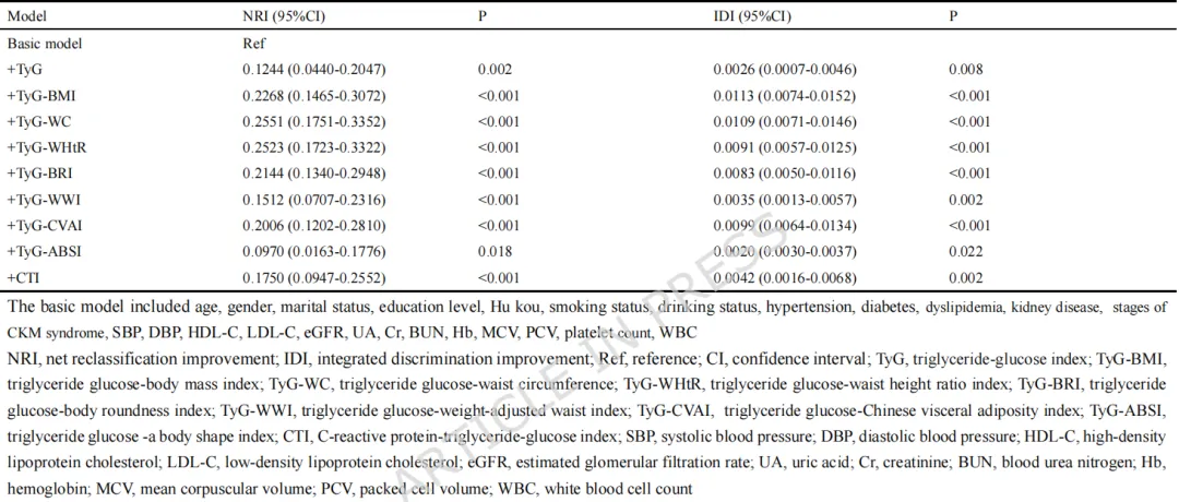 NRI与IDI分析证实,所有指标在常规风险模型基础上均能提供显著的增量预测价值,其中TyG-CVAI的改善幅度尤为突出。
